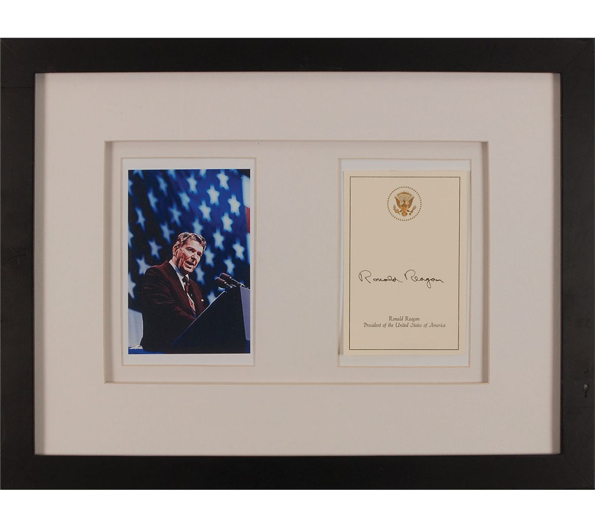 Embossed bookplate, 3.25 x 5, signed in black felt tip, “Ronald Reagan.” Double-matted and framed with a photo of Reagan giving a speech to an overall size of 16.25 x 12.5. In fine condition.