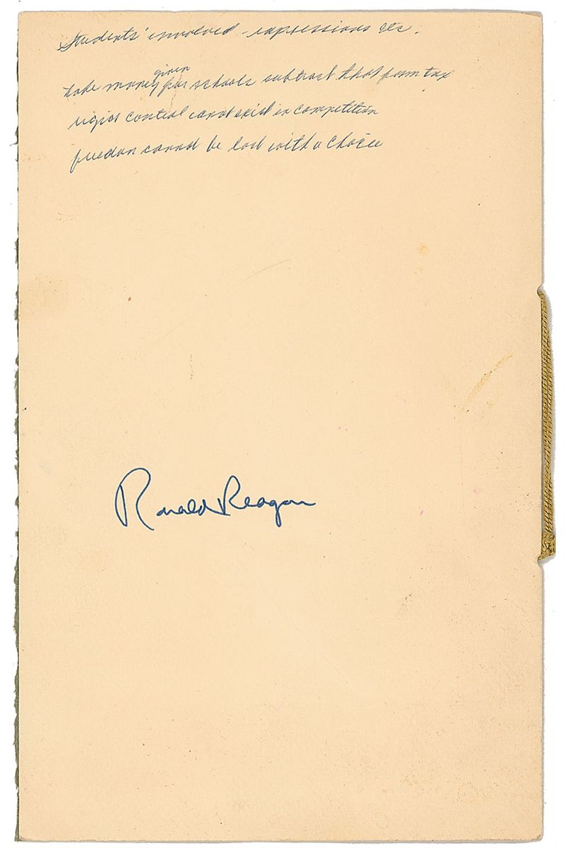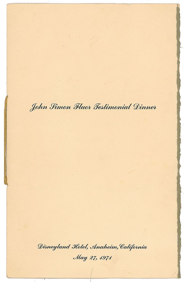 Program for the John Simon Fluor Testimonial Dinner, held at the Disneyland Hotel in Anaheim, California, on May 27, 1954, 8.25 x 13, four pages, signed on the back cover in blue felt tip. The back cover also bears various notes in an unknown hand about education. In fine condition, with some insignificant soiling not affecting the signature.