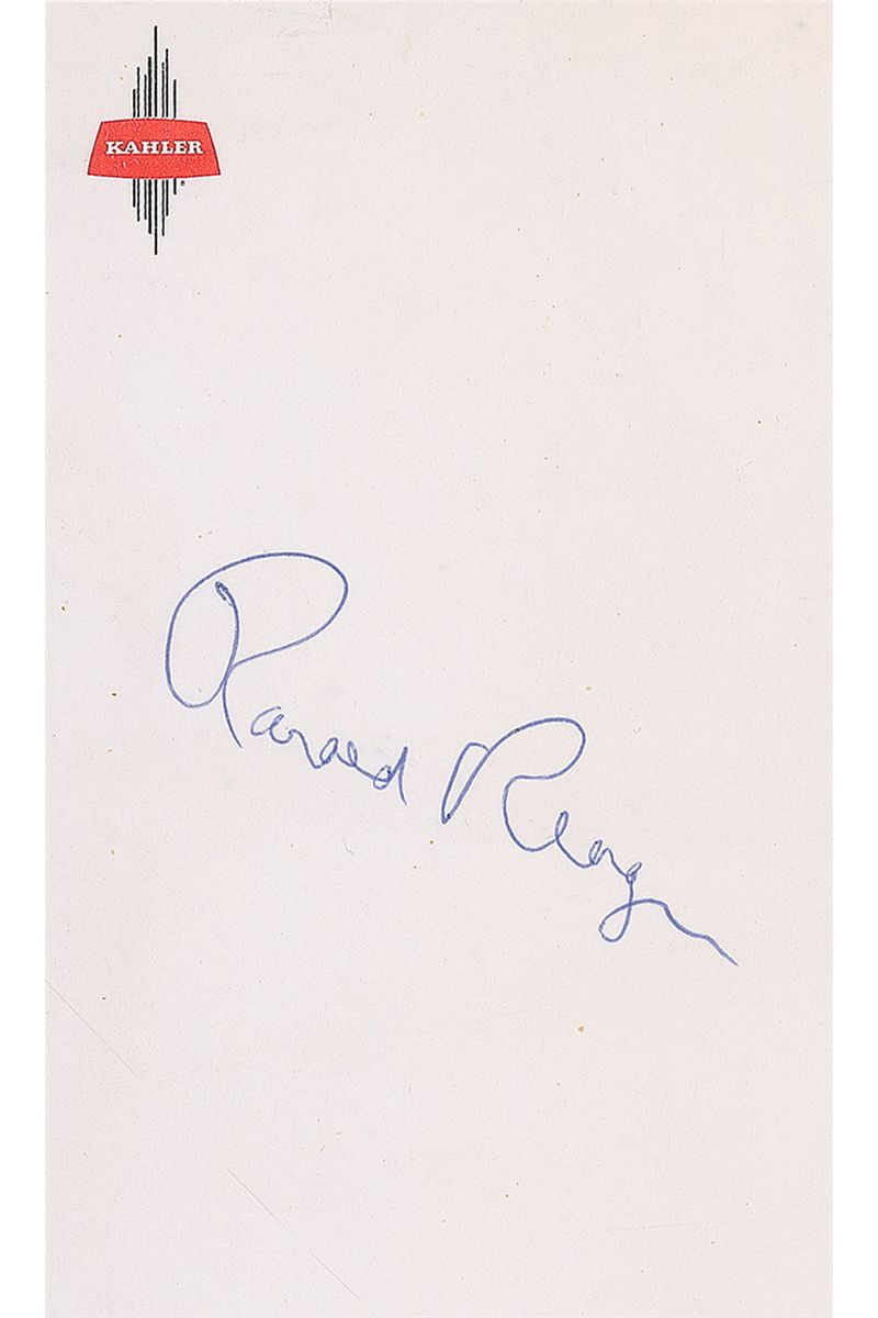 Vintage ballpoint signature, “Ronald Reagan,” on an off-white 3 x 5 sheet of Kahler stationery. In fine condition.