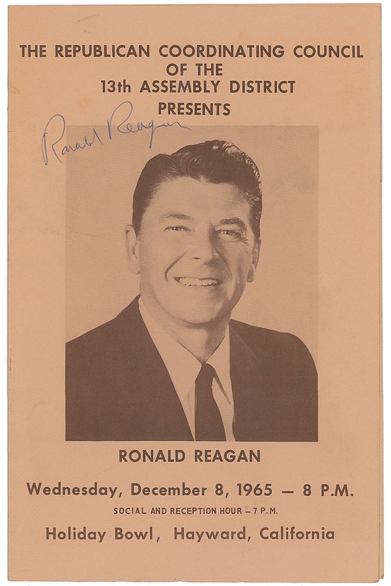 Program from a reception for Reagan by the Republican Coordinating Council of the 13th Assembly District, held at the Holiday Bowl in Hayward, California, on December 8, 1965, 6.5 x 10, signed on the front cover in blue ballpoint. In fine condition.