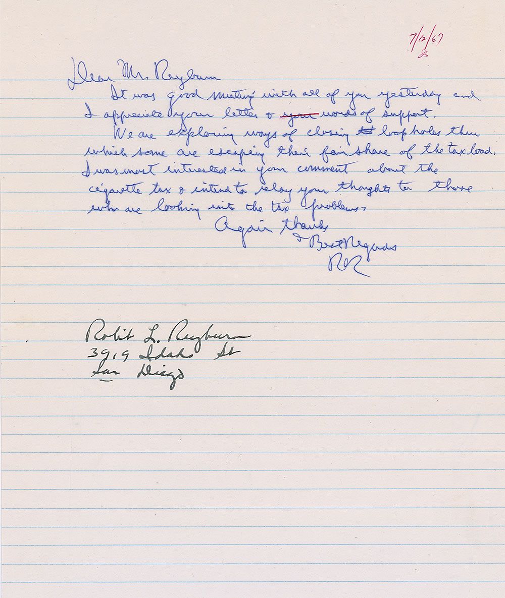 Draft ALS signed “RR,” one page, lightly-lined, 8.5 x 10, secretarially dated July 12, 1967. Draft letter to Robert Reyburn. In part: “We are exploring ways of closing loopholes thru which some are escaping their fair share of the tax load. I was most interested in your comment about the cigarette tax & intend to relay your thoughts to those who are looking into the tax problems.” In fine condition, with mild scattered creases.