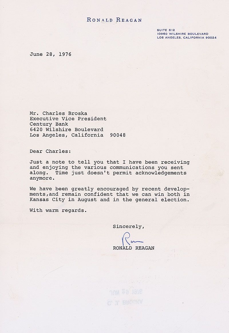 TLS signed “Ron,” one page, 7.25 x 10.25, personal letterhead, June 28, 1976. Letter to a supporter. In part: “Just a note to tell you that I have been receiving and enjoying the various communications you sent along…We have been greatly encouraged by recent developments, and remain confident that we can win both in Kansas City in August and in the general election.” In fine condition.