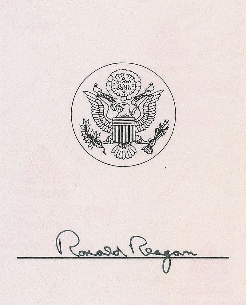 Unused off-white bookplate featuring the presidential seal, 3.5 x 4.5, signed at the bottom in black felt tip. In very fine condition.