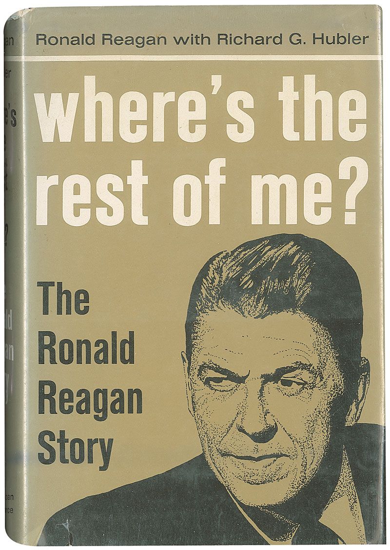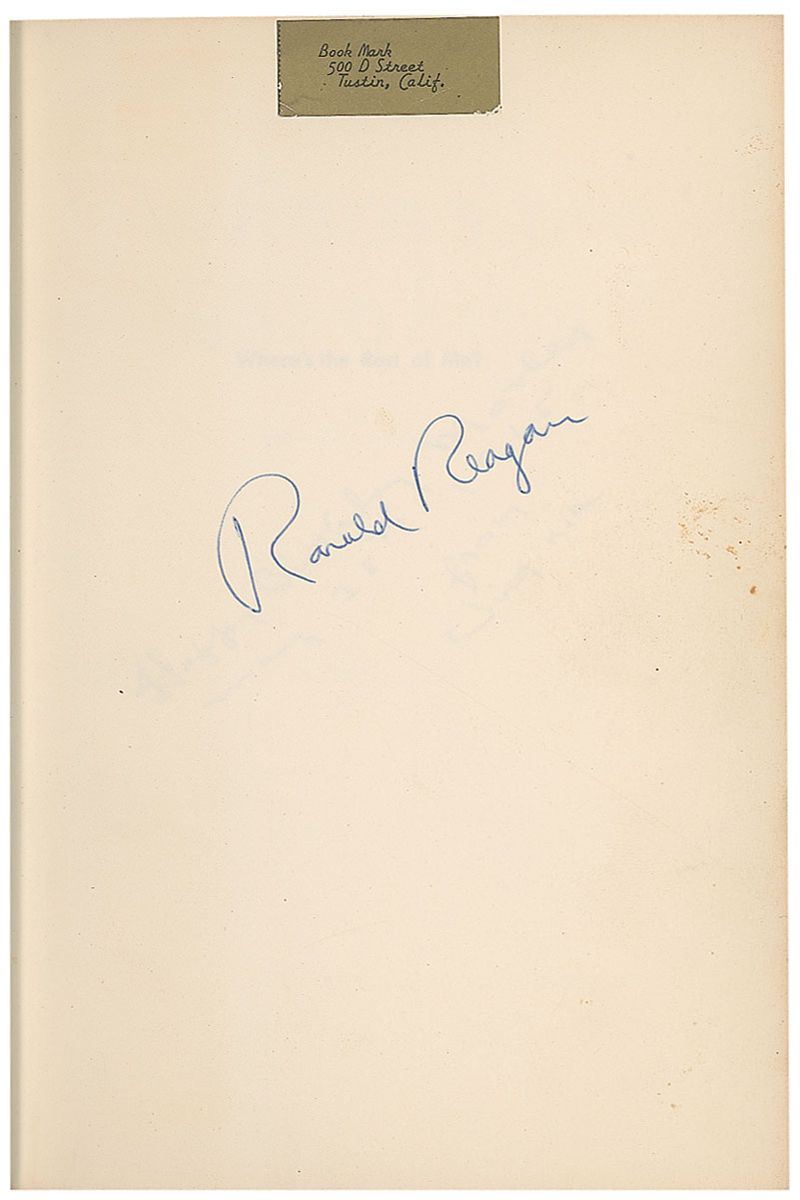 Signed book: Where’s the Rest of Me? First edition. NY: Duell, Sloan, and Pearce, 1965. Hardcover with dust jacket, 5.75 x 8.25, 316 pages. Signed in blue ballpoint on the first free end page. Autographic condition: a small label applied to top of signed page and some scattered mild toning, otherwise fine condition. Book condition: VG/VG-. Navy cloth-covered boards with gilt lettering to spine; minor wear and light sunning to edges; previous seller’s small sticker to ffep; minor yellowing (mostly at pastedowns). Dust jacket in protective mylar sleeve; small tears and creases to edges; two light blue stains across jacket; spine sunned; slightly yellowed; price-clipped.