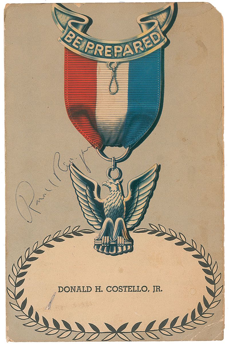 Program for an Eagle Scout award ceremony held in Chula Vista, California, circa late 1960s, 5.5 x 8.5, two pages, signed on the front in blue ballpoint by Reagan, who presented the award. In very good condition, with scattered creases and soiling.
