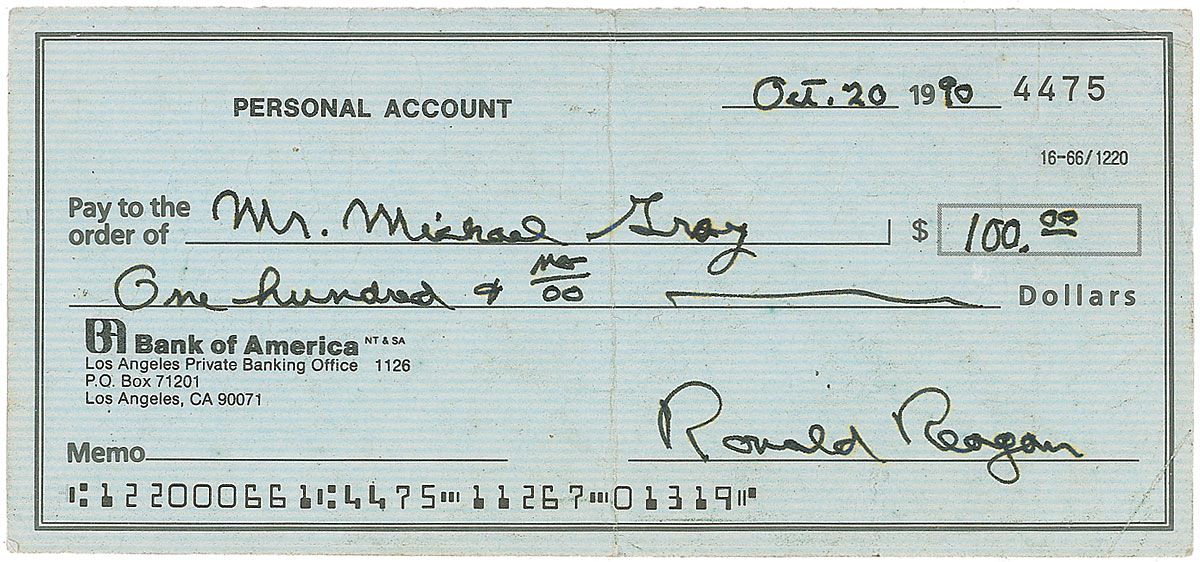Uncommon personal check, 6 x 2.75, filled out and signed by Reagan, payable to Mr. Michael Gray for $100.00, October 20, 1990. A central vertical fold and some scattered light creases and wrinkles, otherwise fine condition.