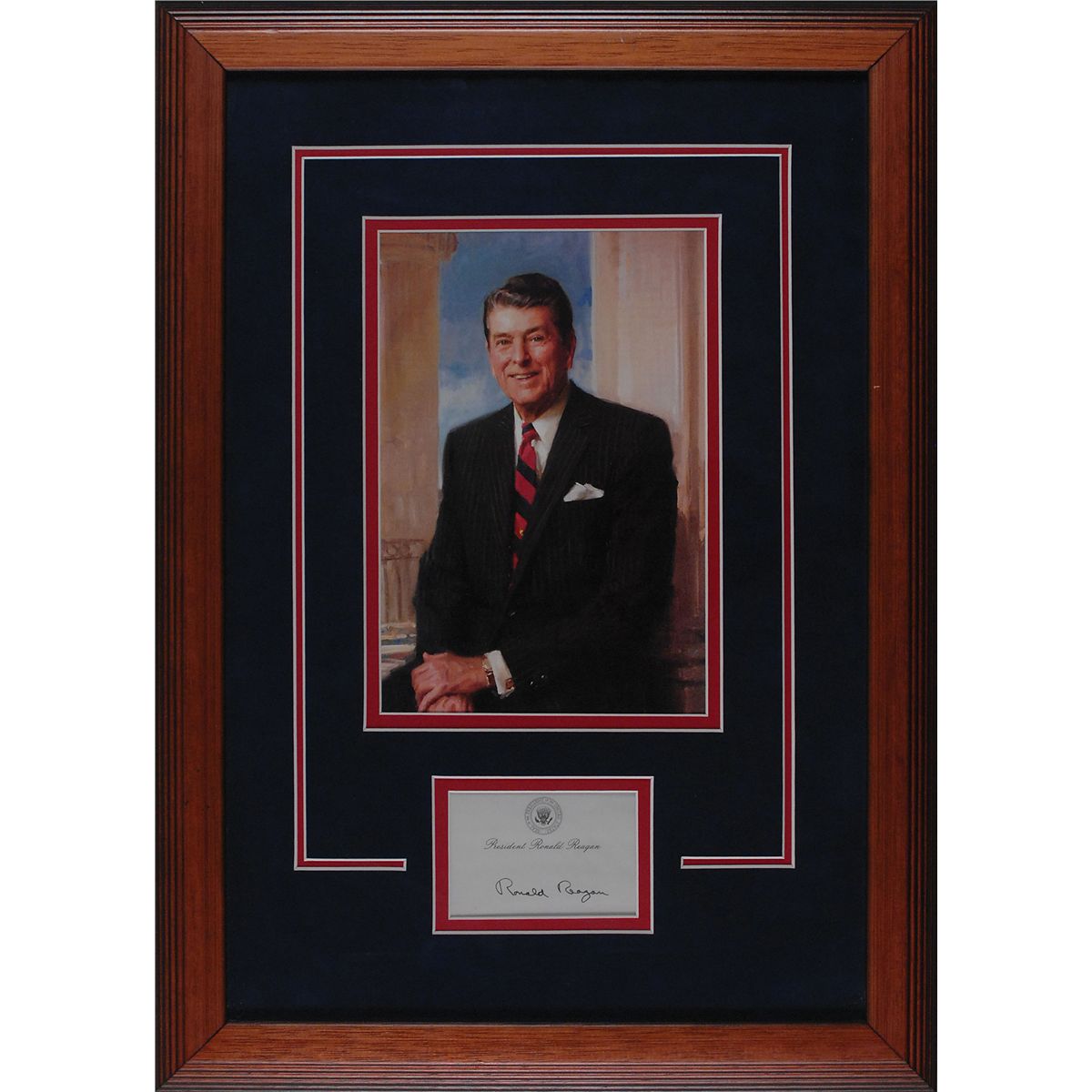 Black ink signature, “Ronald Reagan,” on Reagan’s personal off-white 4 x 3 “Post-It” sheet with printed presidential seal. Double-matted and framed with a color image of Reagan to an overall size of 15.5 x 21.5. In very fine condition. Following his presidency, Reagan pre-signed these sheets and carried them around with him as a way of easily complying with requests for autographs.