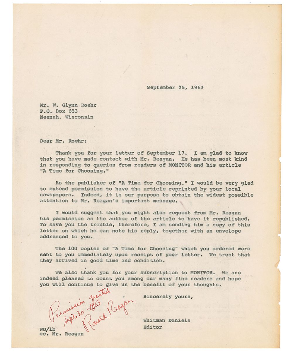 Handwritten endorsement, signed “Ronald Reagan,” on one onionskin page TLS from editor of the Monitor Whitman Daniels to Mr. W. Glynn Roehr, of Neenah, Wisconsin, dated September 25, 1963. The letter asks permission to reprint Reagan’s A Time for Choosing. Letter reads, in part: “You might also request from Mr. Reagan his permission as the author of the article to have it republished. To save you the trouble, therefore, I am sending him a copy of this letter on which he can note his reply, together with an envelope addressed to you." Reagan has endorsed the letter in red ink, "Permission granted/Sept. 30 - 1963/Ronald Reagan." Toning along two edges, and some creases and small tears along right edge, otherwise fine condition.
