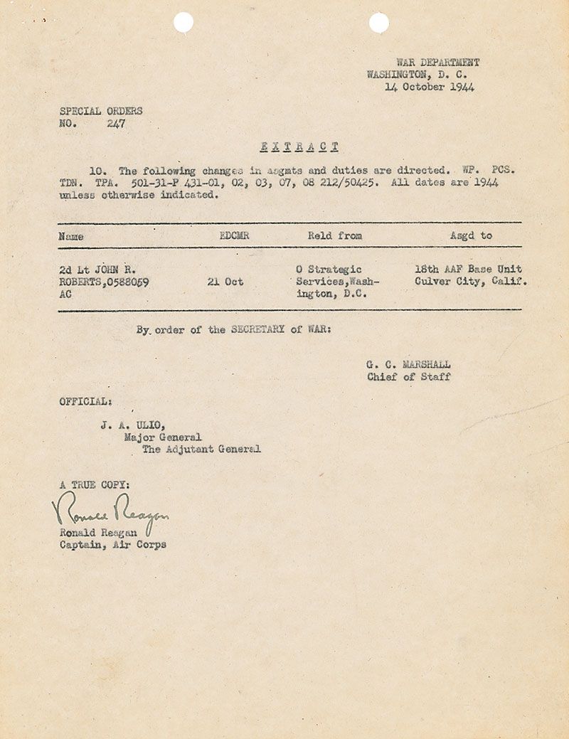Early carbon DS signed in ink “Ronald Reagan” as captain in the US Army Air Corps, one page on onionskin, 8 x 10.5, October 14, 1944 (but signed later at the 18th AAF Base Unit in Culver City, California). A ‘true copy’ of a document titled “Extract,” from Special Orders No. 247 issued by General George C. Marshall by order of the Secretary of War Henry L. Stimson, concerning the assignment of Second Lieutenant John R. Roberts, then at the Office of Strategic Services (forerunner of the CIA) to the 18th Army Air Force Base Unit, Culver City, California. The document bears a typed “official” certification by Major General James A. Ulio, Adjutant General of the Army. Expected document wear, otherwise fine condition.