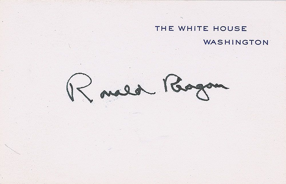 Uncommon White House card, 4 x 2.5, signed in black ink, “Ronald Reagan.” In fine condition, with a couple of trivial brushes to signature.