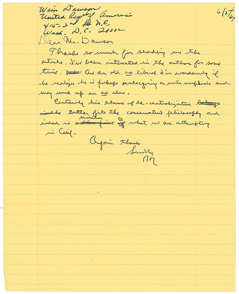 Draft ALS signed “RR” as governor of California, one lightly-lined yellow page, 8 x 10, June 5, 1967. Handwritten draft letter to Wain Dawson. In full: “Thanks so much for sending me the article. I’ve been interested in the author for some time. As an old ex liberal I’m wondering if he realizes he is perhaps undergoing a metamorphosis and may wind up an ex also. Certainly his theme of decentralization better fits the conservative philosophy and indeed is similar to what we are attempting in Calif.” In fine condition, with a few light creases and Dawson’s mailing address in a secretary’s hand directly above, and close to, Reagan’s salutation.