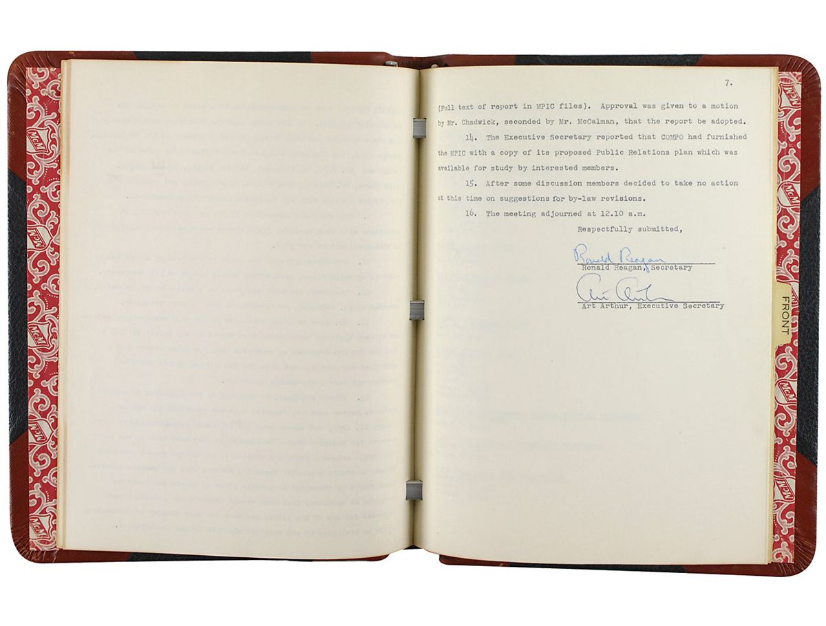 DS, nine pages, 8.5 x 11, January 16, 1952. Records of the meetings of the Motion Picture Industry Council, on which Reagan served as secretary. These are the minutes of a meeting of the MPIC covering the issue of Communist infiltration of the film industry. In part: “The Council then turned its attention to problems stemming from charges of Communism within the industry. The Chairman called upon Mr. Lessing, who introduced Mr. Stanley Kramer. Mr. Kramer outlined the circumstances of his libel suit against the Wage Earners Committee; pictured the difficulties of the producer who wishes to avoid employing Communists or pro-Communists but who lacks what he described as a “yardstick” which would provide protection against attack, and then answered numerous questions. Mr. John Ford indicated that Mr. Kramer could count upon him as a witness if he desired to have Mr. Ford testify on his behalf. After extended discussion covering many facets of the problem… the Chairman designated a sub-committee… to draw up a statement of the MPIC’s position, which subsequently was… approved as follows: ‘The Motion Picture Industry Council commends Stanley Kramer for his courageous stand in instituting a libel suit against the Wage Earners Committee for the malicious and unfounded picketing of his picture ‘Death of a Salesman’ and pledge to him our complete support in the action he has taken.’” Minutes are housed in an original heavy hard bound binder embossed in gilt "Motion Picture Industry Council Minute Book.” In fine condition.