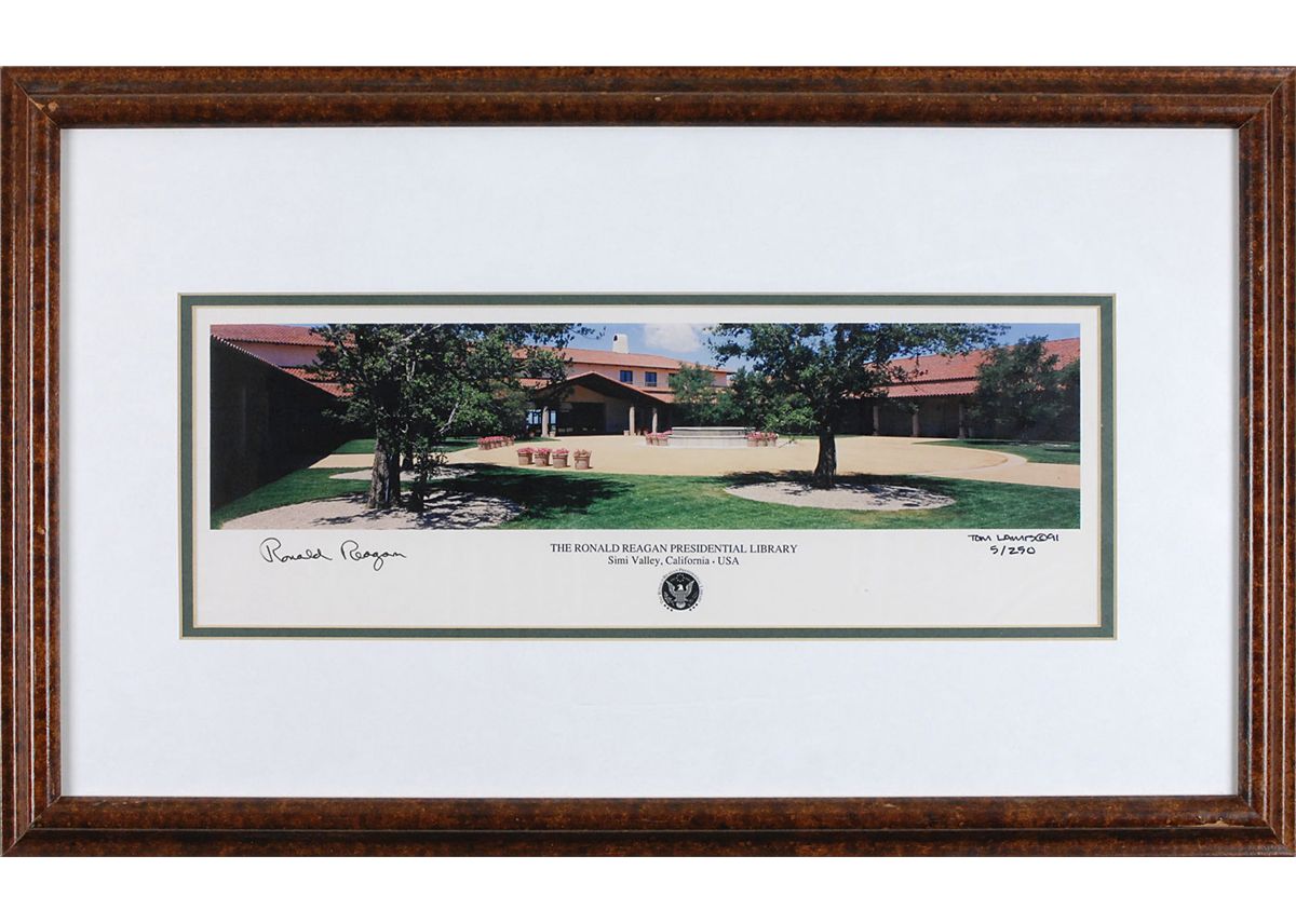 Color limited edition glossy 15 x 5.5 photo of the Reagan Presidential Library, first series, numbered 5/250, signed in black felt tip in the lower margin, “Ronald Reagan,” and also signed by the photographer, Tom Lamb. Double-matted and framed to an overall size of 22 x 13.5. Accompanied by the original Reagan Library certificate. In very fine condition.