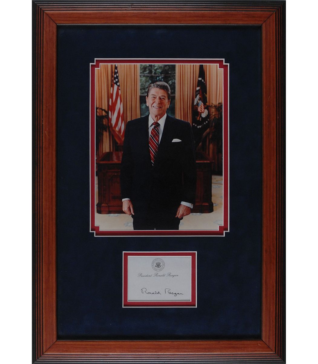 Black ink signature, “Ronald Reagan,” on Reagan’s personal off-white 4 x 3 “Post-It” sheet with printed presidential seal. Double-matted and framed with a color photo of Reagan in the oval office to an overall size of 14.5 x 20.5. In fine condition. Following his presidency, Reagan pre-signed these sheets and carried them around with him as a way of easily complying with requests for autographs.