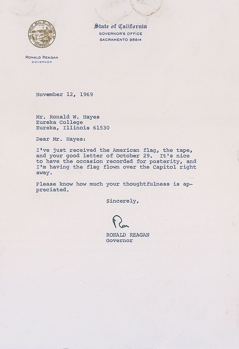 TLS signed “Ron,” one page, 7.25 x 10.25, State of California letterhead, November 12, 1969. Letter to Ronald W. Hayes. In part: “I’ve just received the American flag, the tape, and your good letter of October 29. It’s nice to have the occasion recorded for posterity, and I’m having the flag flown over the Capitol right away.” Creasing to bottom and top edge, along with some soiling along top, otherwise fine condition.
