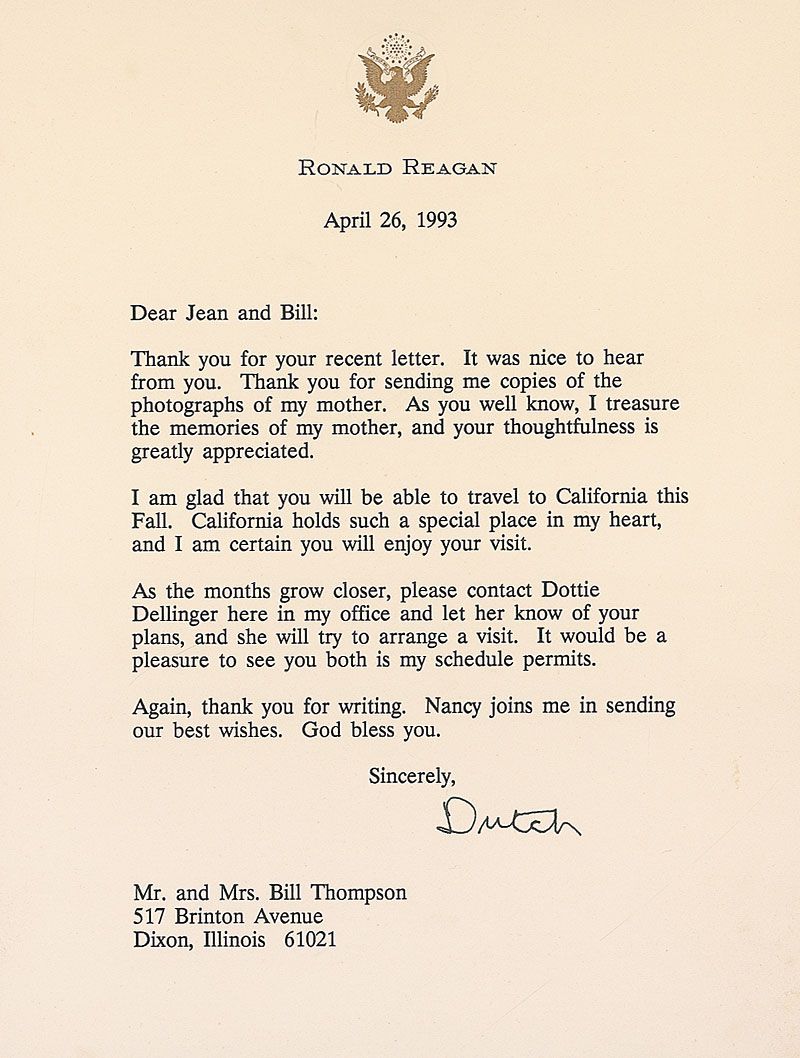 TLS signed “Dutch,” one page, 6.25 x 8.5, personal letterhead, April 26, 1993. Letter to Jean and Bill Thompson. In part, “Thanks for sending me copies of the photographs of my mother. As you well know, I treasure the memories of my mother, and your thoughtfulness is greatly appreciated. I am glad that you will be able travel to California this Fall. California holds such a special place in my heart and I am certain you will enjoy your visit.” In very fine condition.