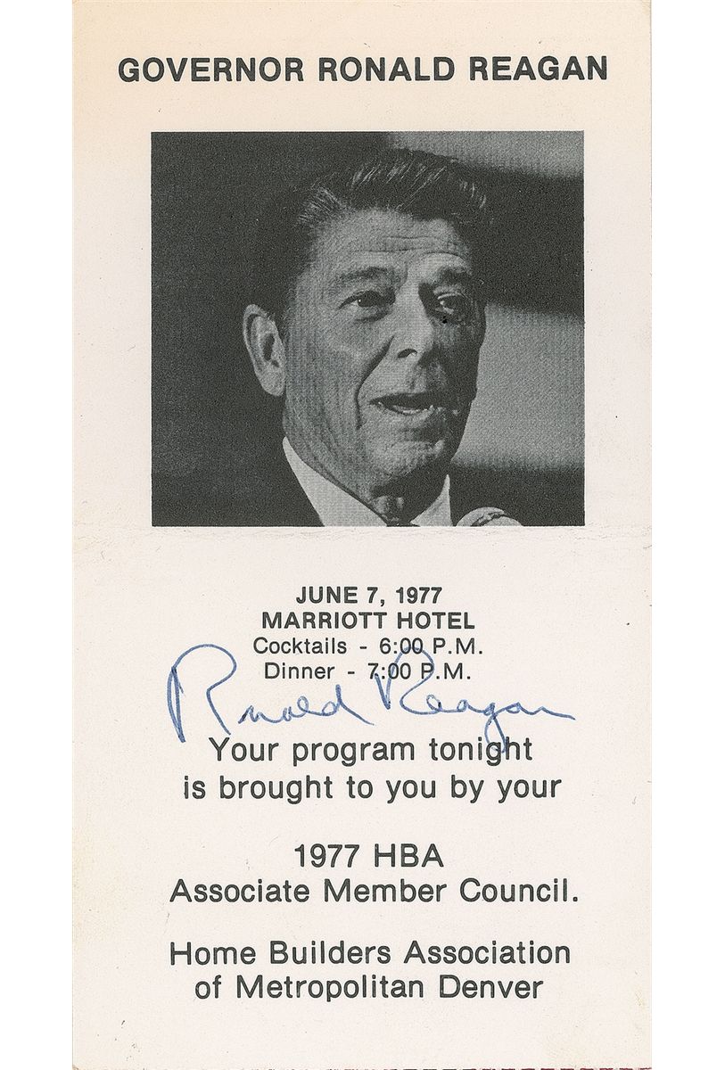 Invitation to a Reagan event held on June 7, 1977, 3.75 x 6.75, signed in blue ballpoint. Central horizontal crease from folding, otherwise fine condition.