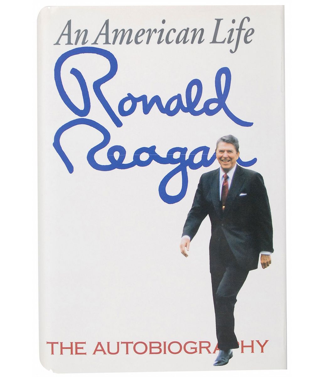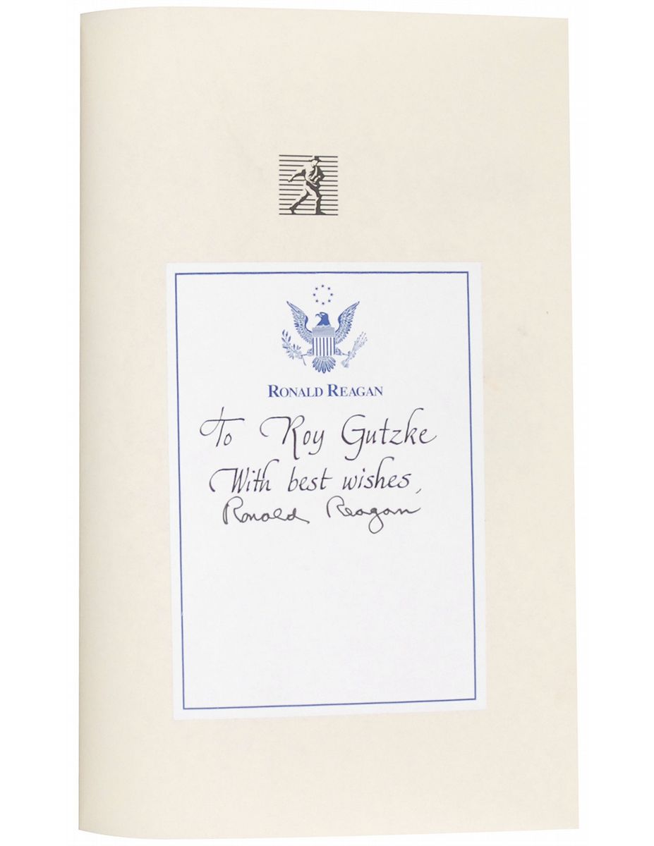 Signed book: An American Life. First edition, first printing. NY: Simon & Schuster, 1990. Hardcover with dust jacket, 6.5 x 9.5, 748 pages. Signed in black felt tip on a bookplate affixed to a free end page, “Ronald Reagan,” and inscribed in a calligrapher’s hand, “To Roy Gutzke, With best wishes.” In fine condition.