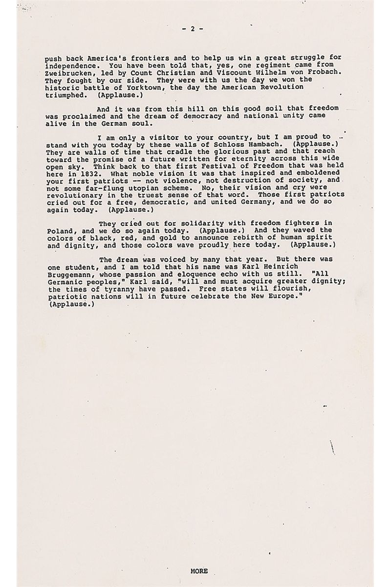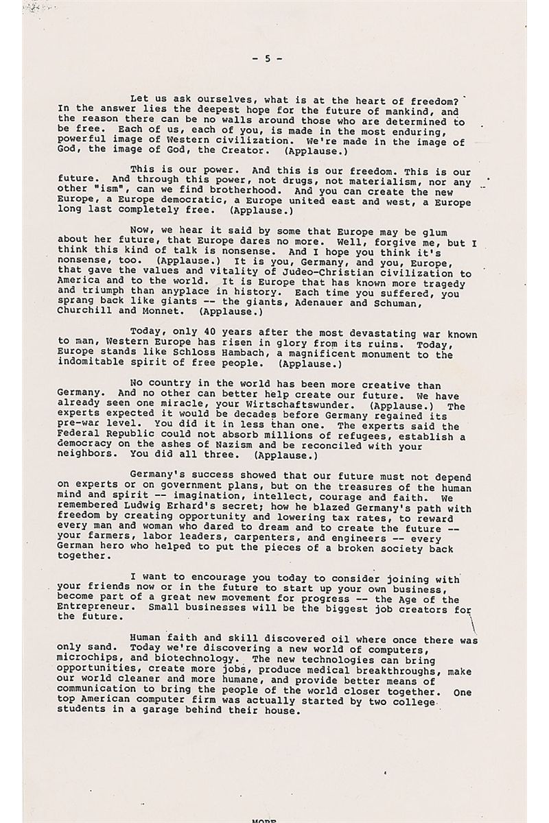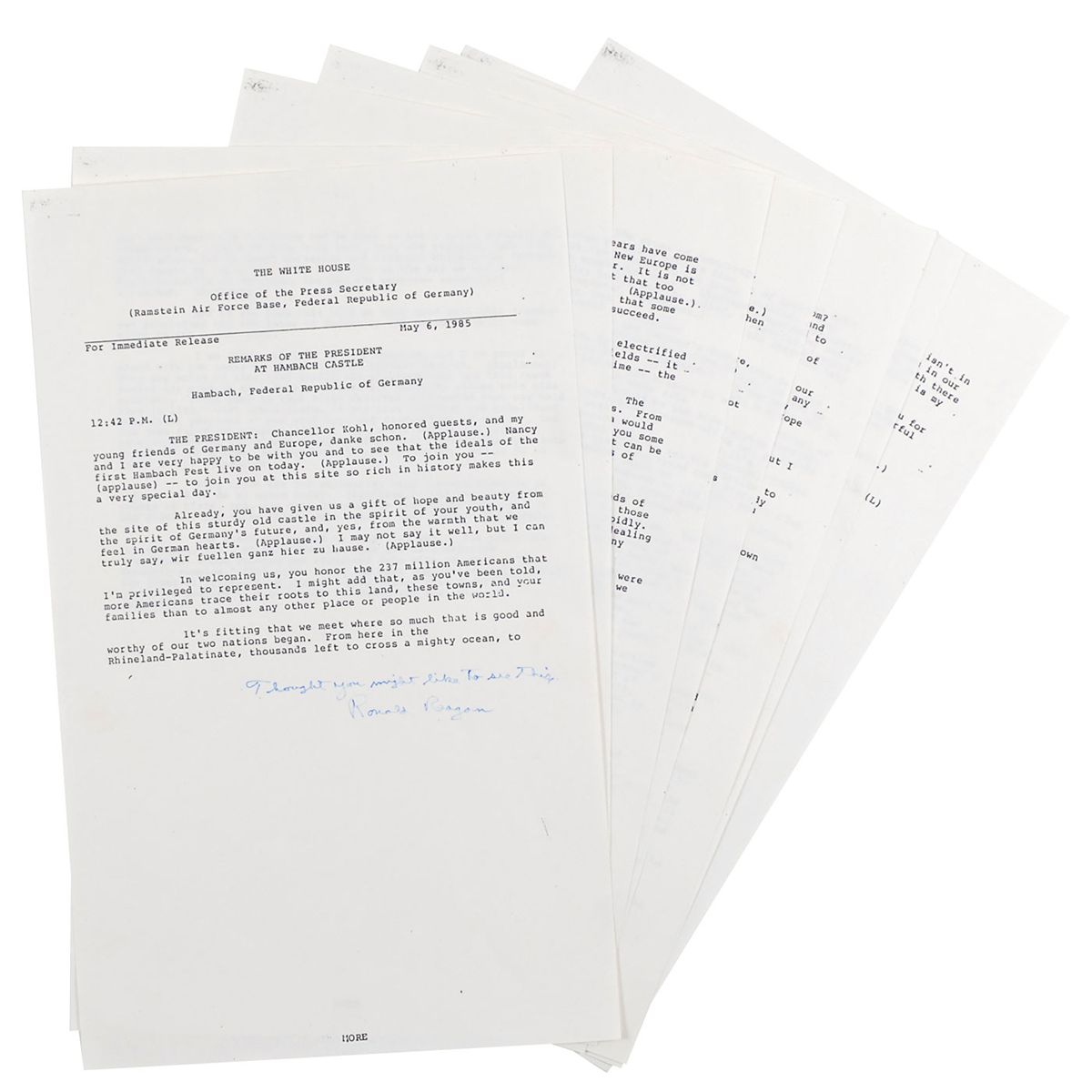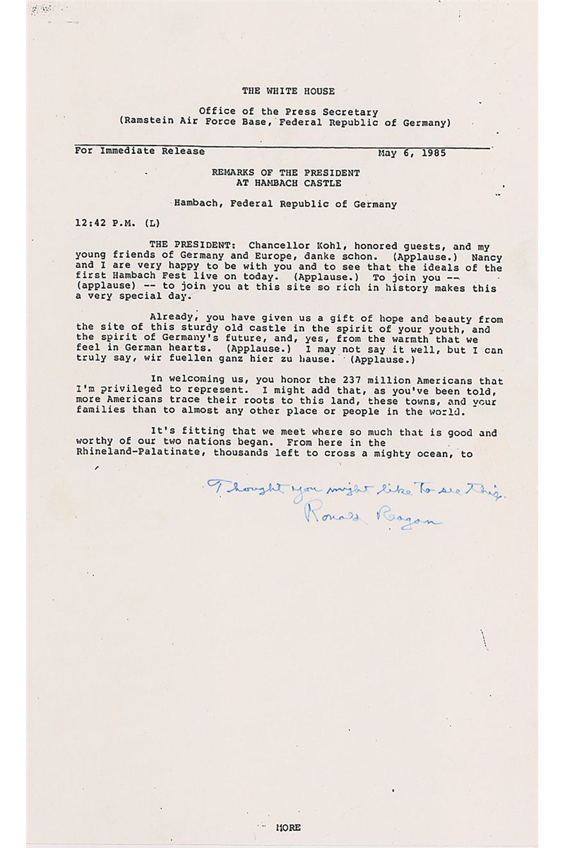 Signed copy of a White House press release, seven pages, 8.5 x 14, of the speech Reagan delivered at Hambach Castle in the Federal Republic of Germany, on May 6, 1985. Speech reads in part: “More Americans trace their roots to this land…than to almost any other place or people in the world…From here…thousands left to cross a mighty ocean, to push back America ’s frontiers and to help us win a great struggle for independence…They were with us the day we won the historic battle of Yorktown…Europe today—divided by concrete walls…is living portrait of the most compelling truth of our time—the future belongs to the free—Europe is divided because part of Europe is not free…History is on the side of those struggling for a true revolution of peace…The first frontier of European liberty begins in Berlin…America will stand by you…Unlike your cousins on the other side of the wall, your future is in your hands…It is Europe that has known more tragedy and triumph than any place in history…Today, only 40 years after the most devastating war known to man, Western Europe has risen in glory from its ruins…The experts said the Federal Republic could not absorb millions of refugees, establish a democracy on the ashes of Nazism and be reconciled with your neighbors. You did all three.” Signed at the bottom of the first page, “Thought you might like to see this. Ronald Reagan.” In fine condition. During his speech, Reagan also made references to his ‘Star Wars’ missile-defense program, as well as the solidarity movement in Poland. His support for the reunification of Germany was certain to upset the Kremlin, which considered the borders agreed on at the end of World War II to be inviolable—especially the division of Germany so it could never again be a military threat.