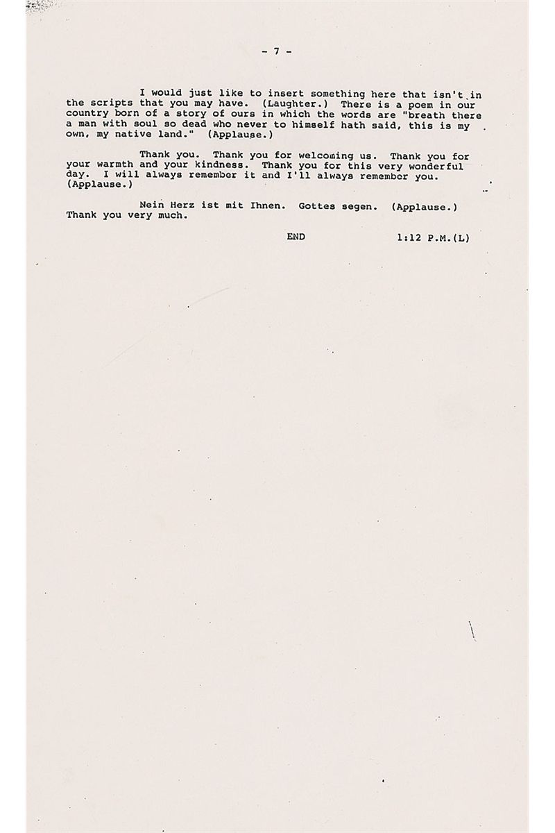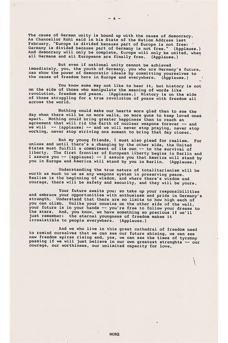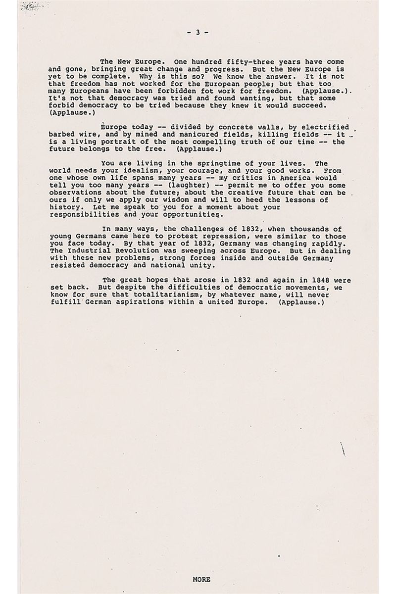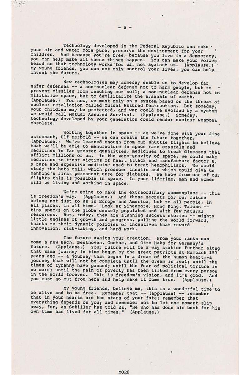 Signed copy of a White House press release, seven pages, 8.5 x 14, of the speech Reagan delivered at Hambach Castle in the Federal Republic of Germany, on May 6, 1985. Speech reads in part: “More Americans trace their roots to this land…than to almost any other place or people in the world…From here…thousands left to cross a mighty ocean, to push back America ’s frontiers and to help us win a great struggle for independence…They were with us the day we won the historic battle of Yorktown…Europe today—divided by concrete walls…is living portrait of the most compelling truth of our time—the future belongs to the free—Europe is divided because part of Europe is not free…History is on the side of those struggling for a true revolution of peace…The first frontier of European liberty begins in Berlin…America will stand by you…Unlike your cousins on the other side of the wall, your future is in your hands…It is Europe that has known more tragedy and triumph than any place in history…Today, only 40 years after the most devastating war known to man, Western Europe has risen in glory from its ruins…The experts said the Federal Republic could not absorb millions of refugees, establish a democracy on the ashes of Nazism and be reconciled with your neighbors. You did all three.” Signed at the bottom of the first page, “Thought you might like to see this. Ronald Reagan.” In fine condition. During his speech, Reagan also made references to his ‘Star Wars’ missile-defense program, as well as the solidarity movement in Poland. His support for the reunification of Germany was certain to upset the Kremlin, which considered the borders agreed on at the end of World War II to be inviolable—especially the division of Germany so it could never again be a military threat.