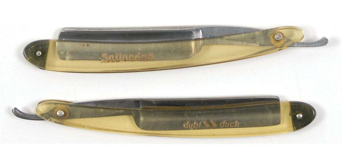 Two vintage Dubl Duck ‘Satinedge’ straightedge razors, used by William Gornik of Drucker's Barber Shop to shave Reagan and his other celebrity clientele. Gornik worked at Drucker's Barber Shop on Wilshire Boulevard in Beverly Hills, where Reagan frequented for a long period of time—he began going there during his acting days in the 1940s and continued to patronize the establishment throughout his gubernatorial and presidential years. Also includes a wooden felt-lined box given to Gronik when he retired, 13 x 5 x 2, featuring a lacquered image of a classic pioneer scene on top. Inside is a printed card that reads, “With Best Wishes From the President.” In overall fine condition. A one-of-a-kind presidential item from one of our nation’s best-groomed leaders.