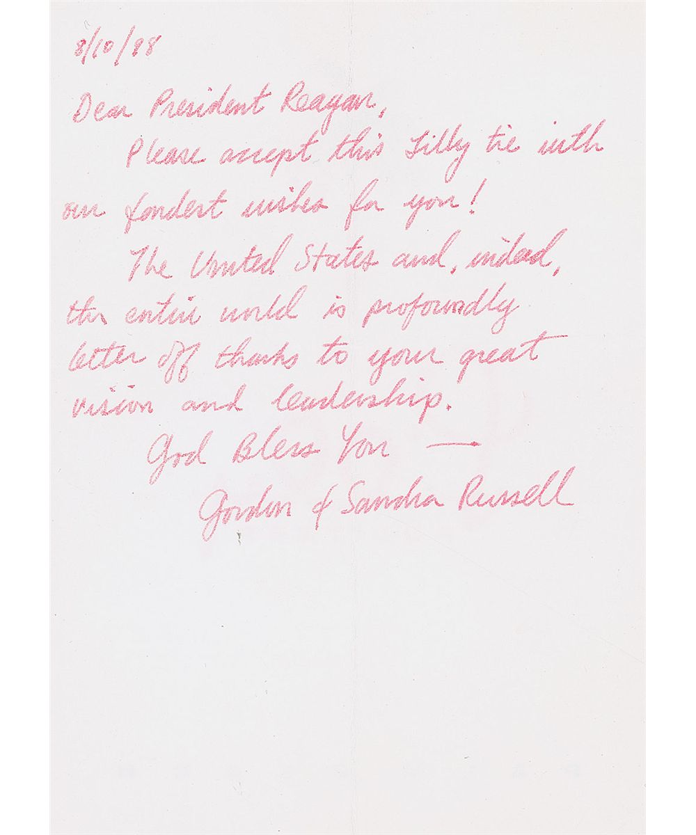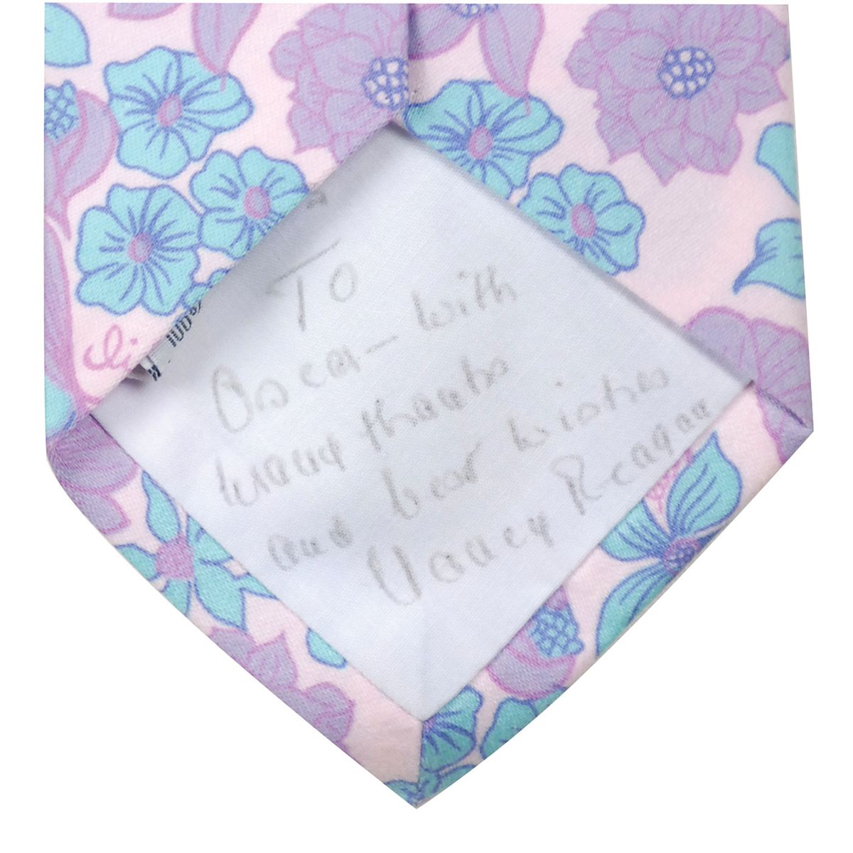 Reagan’s personally-owned blue, pink, and purple floral pattern necktie from the Lilly Pulitzer store in Nantucket, measuring approximately 59? long. Signed and inscribed on the reverse of the wide end of the tie by Mrs. Reagan, “To Oscar—with warm thanks and best wishes, Nancy Reagan.” In very fine condition. Accompanied by the original box, Lilly Pulitzer business card of Gordon C. Russell, and a letter from Russell dated August 10, 1998, in full: “Dear President Reagan, please accept this Lilly tie with our fondest wishes for you! The United States and, indeed, the entire world is profoundly better off thanks to your great vision and leadership.”