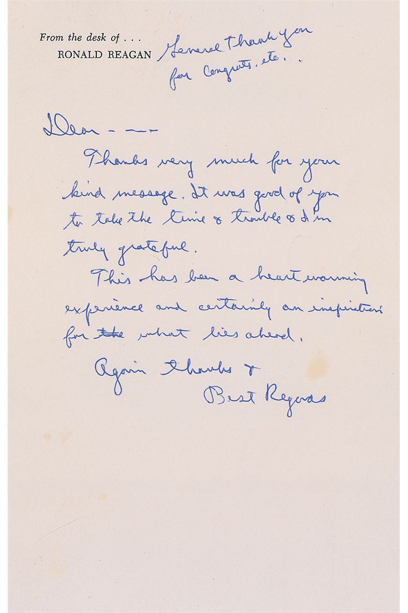Draft autograph letter, unsigned, one page, 5.5 x 8.5, personal letterhead, no date. Draft letter reads, in full: “Thanks very much for your kind message. It was good of you to take the time & trouble & I’m truly grateful. This has been a heart warming experience and certainly an inspiration for what lies ahead.” Reagan has also made a notation at the top which reads, “General thank you for congrats, etc.” In fine condition, with a small spot above the letter’s closing.