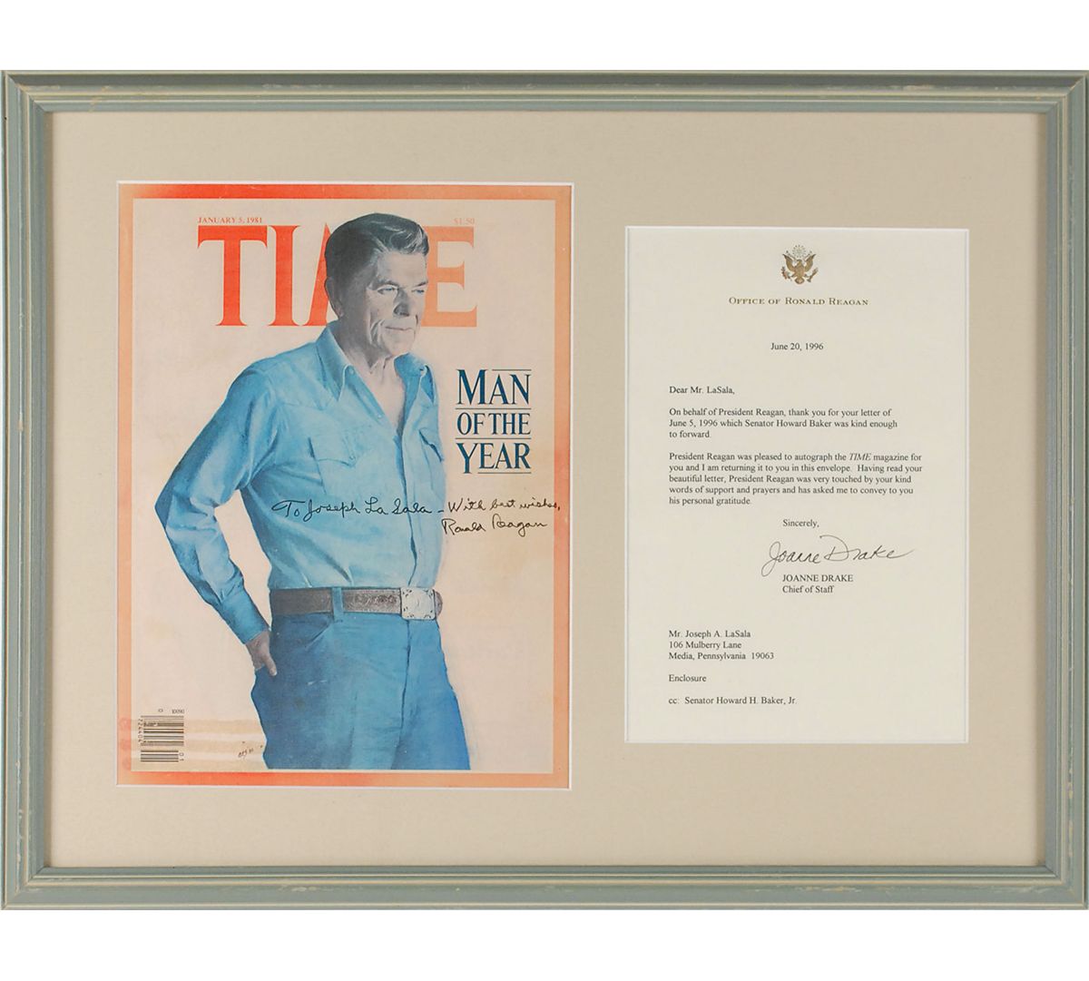 Magazine cover from the January 5, 1981, issue of Time magazine, honoring Reagan as Man of the Year, signed and inscribed in black ink, “To Joseph LaSala—With best wishes, Ronald Reagan.” Accompanied by a 1996 letter from Reagan‘s Chief of Staff acknowledging the signature. The cover and letter are matted and framed to an overall size of 19.25 x 15. Magazine colors uniformly faded and adhesive remnants from a mailing label to lower left, otherwise fine condition.