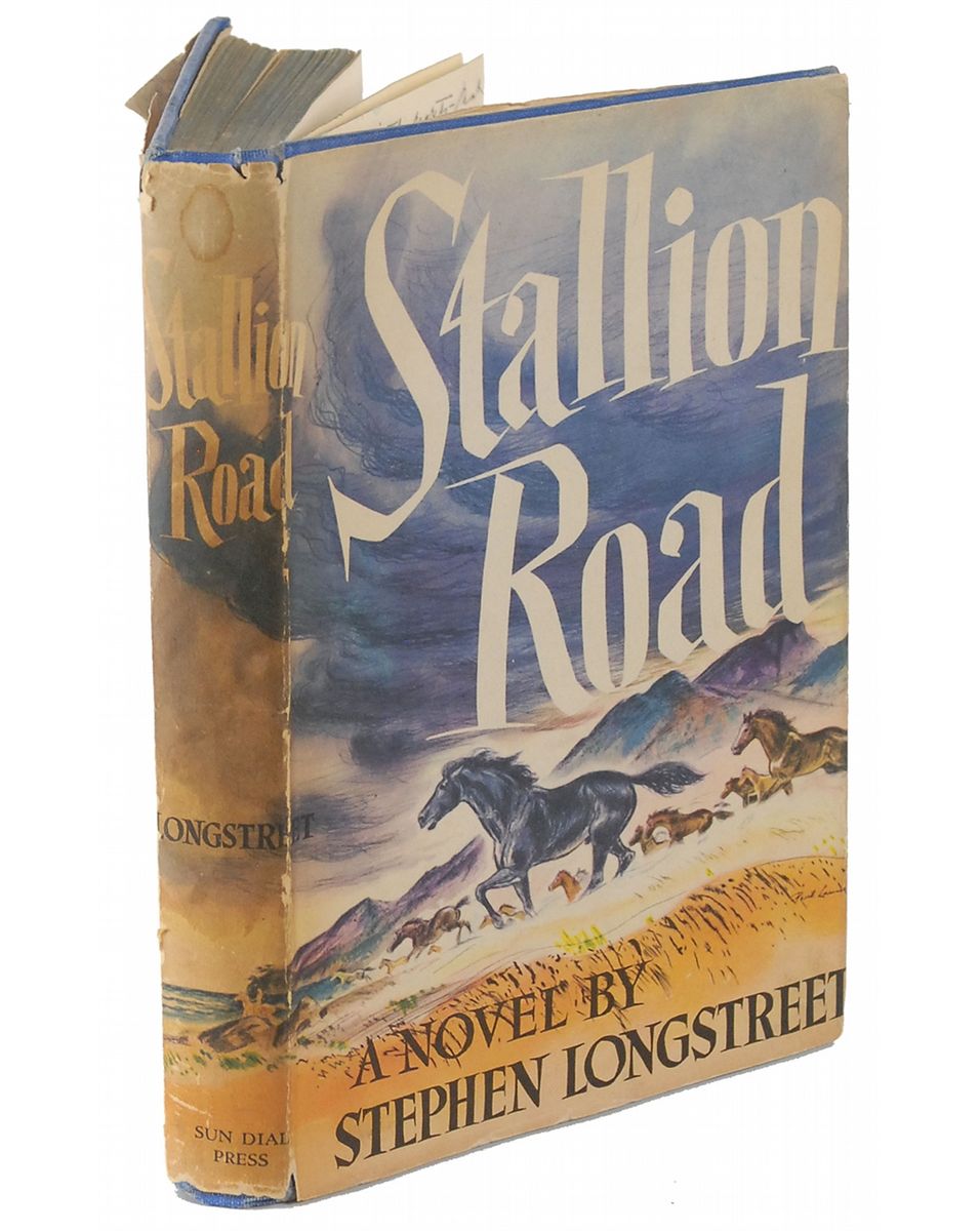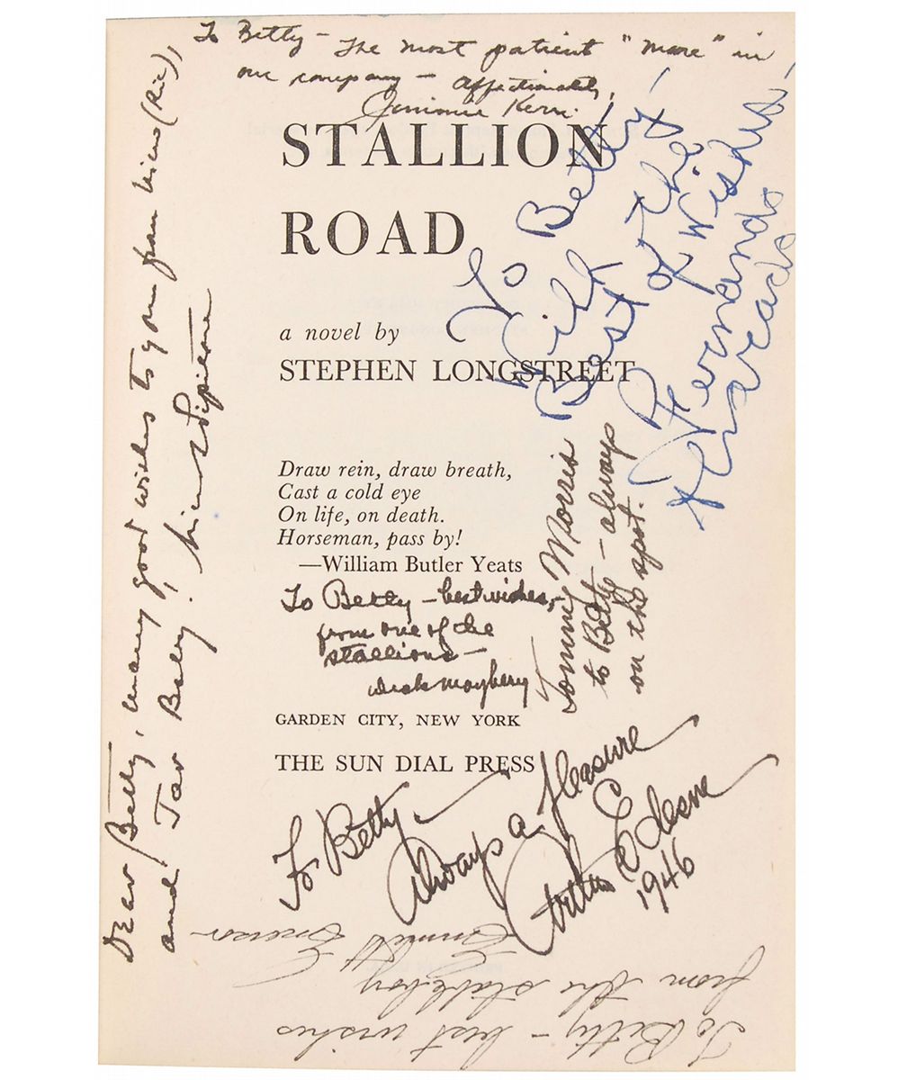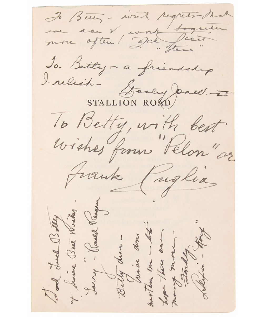 Signed book: Stallion Road. Later printing. NY: Sun Dial Press, 1946. Hardcover with dust jacket, 5.75 x 8, 303 pages. Signed and inscribed on the half-title page, “Good luck Betty & sincere best wishes—‘Larry’—Ronald Reagan.” Opening pages are also signed and inscribed by 13 other cast and crew members including: Alexis Smith, Zachary Scott, Frank Puglia, Fernando Alvarado, Tommy Morris, Dick Mayberry, and Joan Winfield. In fine condition.