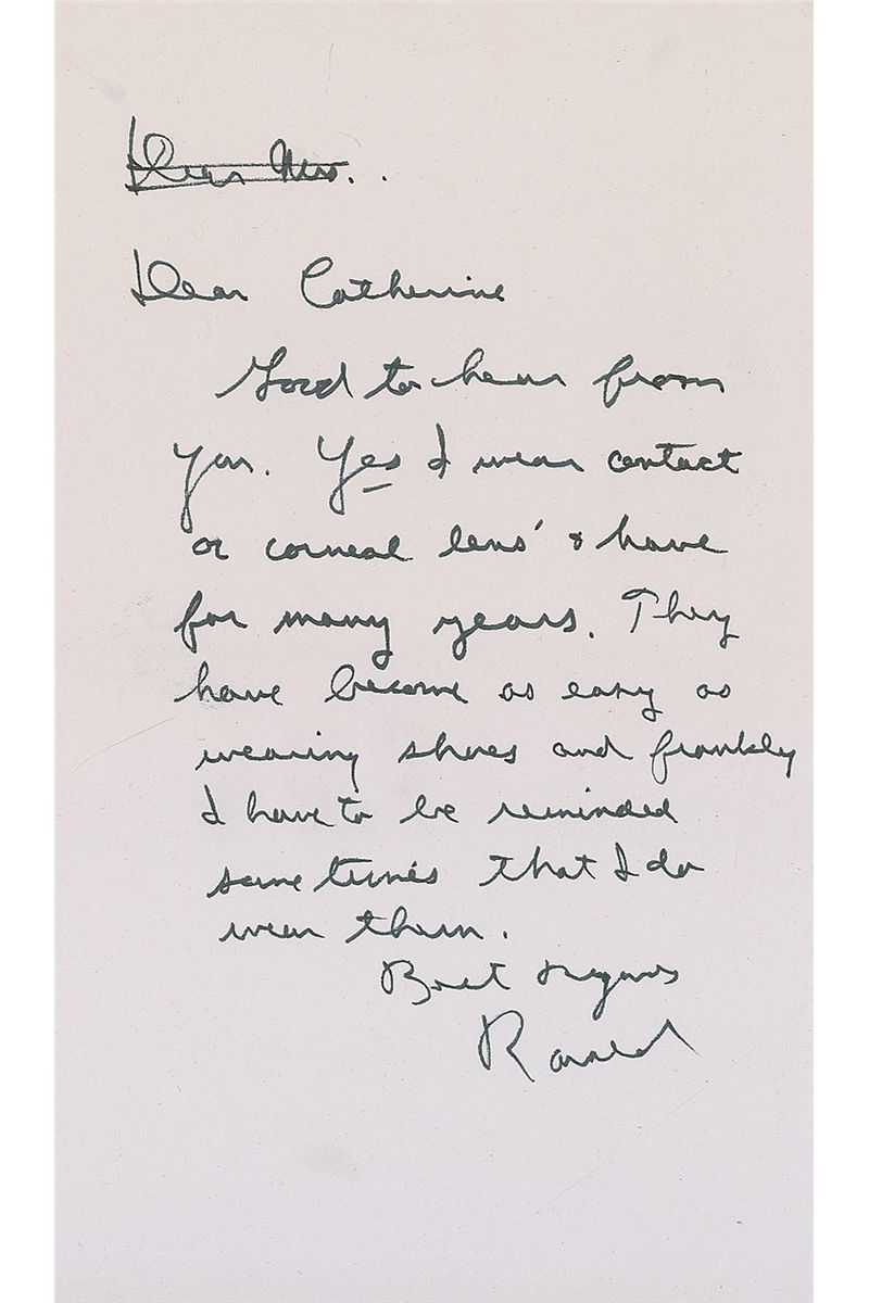 Draft ALS signed “Ronald,” one page, 4.75 x 8.5, no date. A letter to Catherine. In full: “Good to hear from you. Yes I wear contact or corneal lens’ & have for many years. They have become as easy as wearing shoes and frankly I have to be reminded sometimes that I do wear them.” In fine condition.