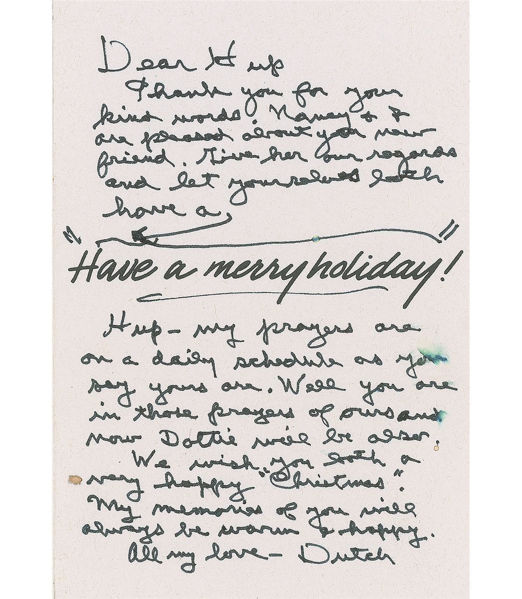 ALS signed “Dutch,” one page, 4 x 5.75, no date. Letter to his longtime friend Lydia “Hup” MacArthur, written inside a Christmas card. In full: “Thank you for your kind words, Nancy & I are pleased about your new friend. Give her our regards and let yourselves both have a [pre-printed sentiment Have a Merry Holiday]. Hup—my prayers are on a daily schedule as you say yours are. Well you are in those prayers of ours and now Dottie will be also. We wish you both a very happy ‘Christmas.’ My memories of you will always be warm & happy.” In fine condition, with a couple of slight brushes to text and a couple of trivial spots.
