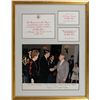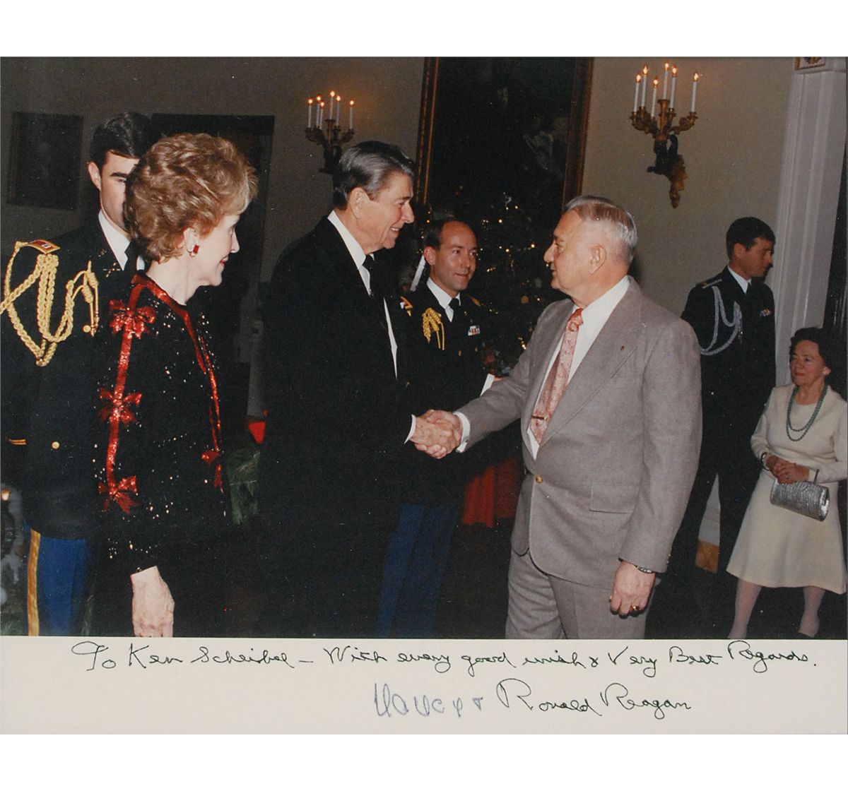Color satin-finish 9.5 x 7.5 photo of Reagan greeting Ken Scheibel at the White House, signed and inscribed in black felt tip, “To Ken Scheibel—With every good wish & Very Best Regards, Ronald Reagan,” with his wife Nancy signing her first name in front of her husband’s. Matted and framed with an invitation to the Christmas Open House at the White House on December 15, 1988, the response card for the social secretary, and an admission pass to the event to an overall size of 13 x 16.5. In fine condition.