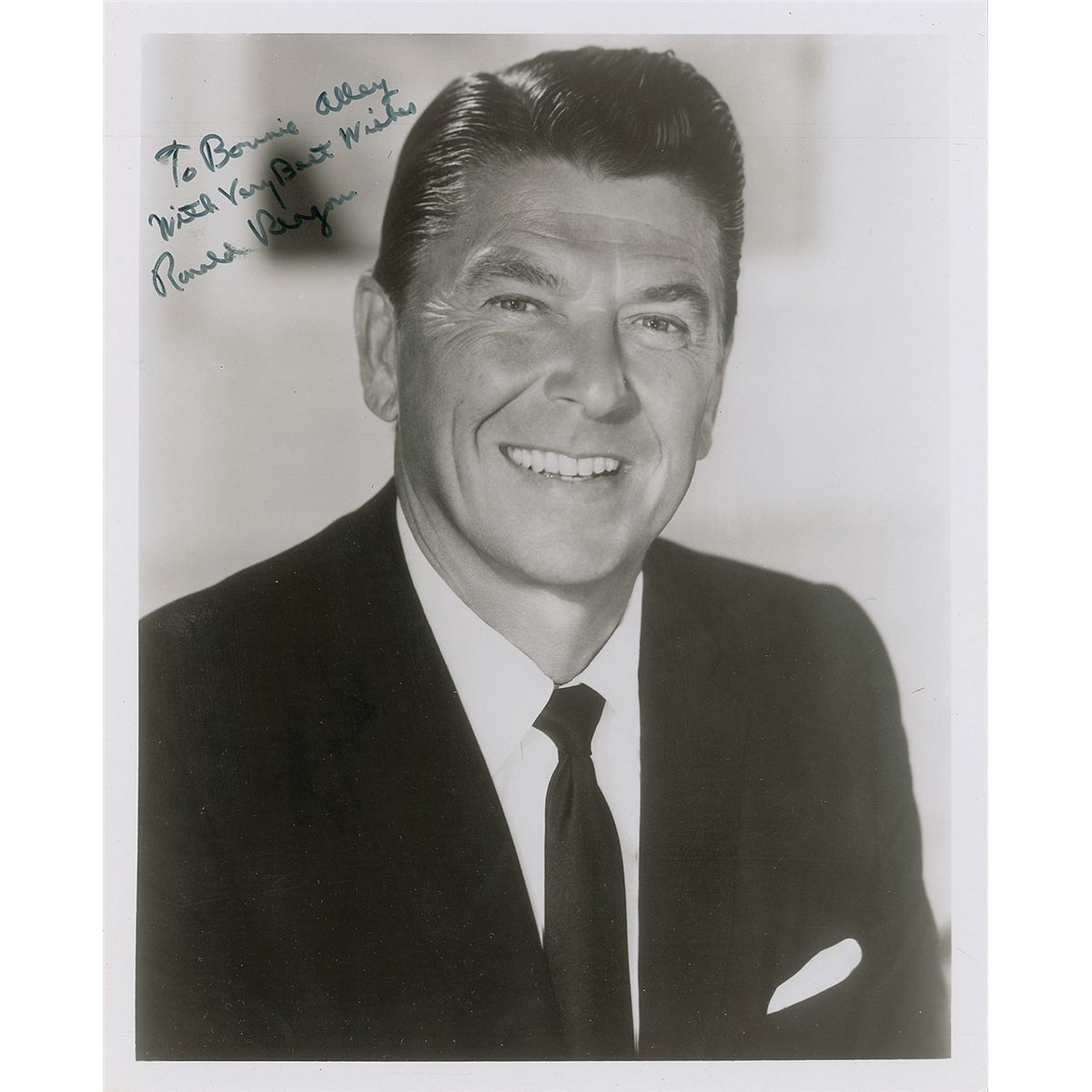 Glossy 8 x 10 photo, signed and inscribed in black felt tip, “To Bonnie Alley, with very best wishes, Ronald Reagan.” In fine condition.