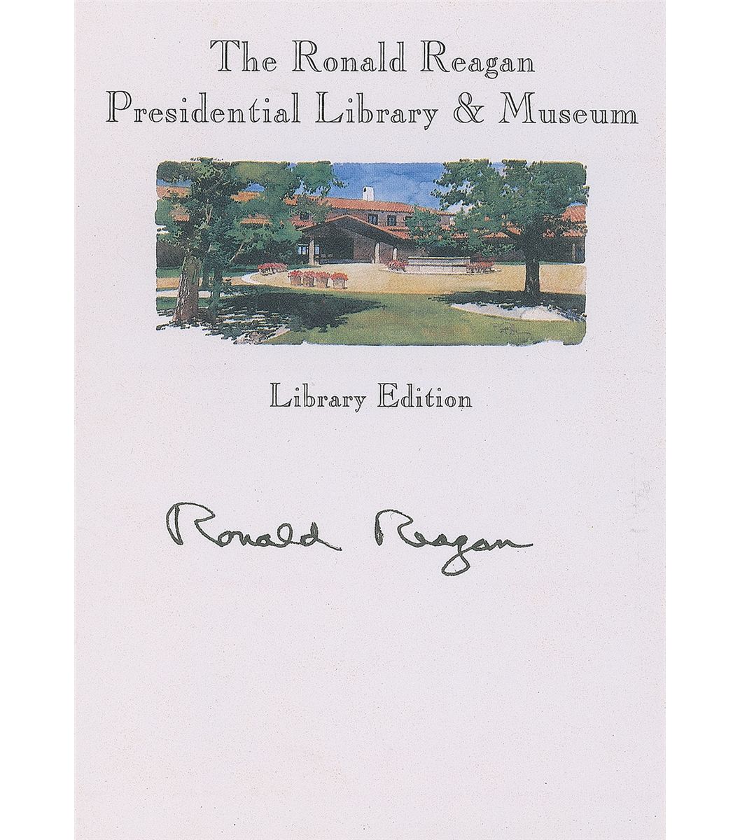 Off-white unused 3.5 x 5 bookplate depicting the Ronald Reagan Presidential Library & Museum, signed in black felt tip. In fine condition.