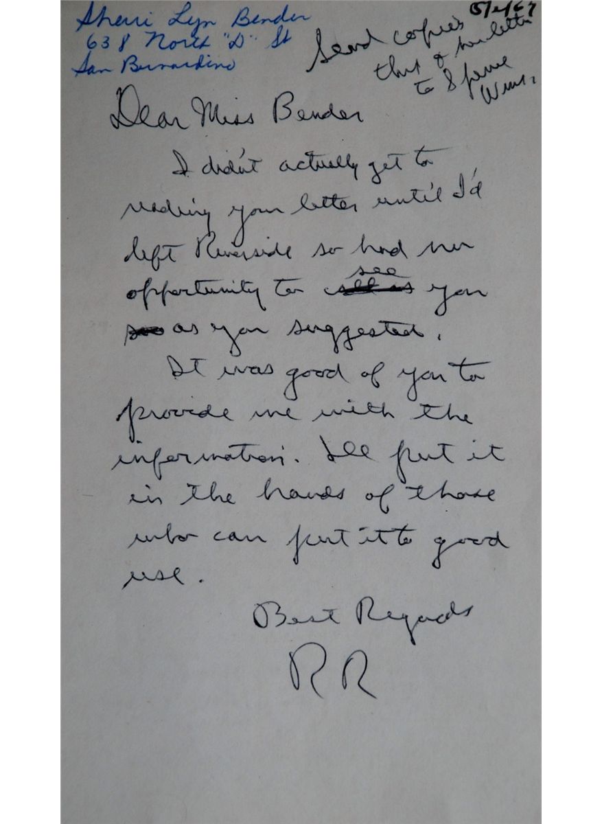 40th President of the U.S. ALS 5/2/67 to Miss Bender. This is Reagan’s draft copy and was written when Governor of California. Reagan wrote in longhand many letters that would subsequently be typed. “ I didn’t actually get to reading your letter until I’d left Riverside so had no opportunity to see you as you suggested. It was good of you to provide me with the information. I’ll put it in the hands of those who can put it to good use. Best regards.” Signed “R R." Reagan penned in the corner instructions for his secretary to “Send copies of this & her letter to Spence Wms.” He has also made two corrections to the text. Approximately 8 x 5”.