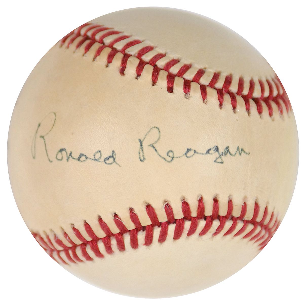 Rare official Rawlings National League (Feeney) baseball signed in black felt tip, “Ronald Reagan.” Overall toning, light soiling, and some scuffs to the right of the signature, otherwise fine condition. A rarely seen example of one of the most desirable presidential formats, combining America’s history with its national pastime.