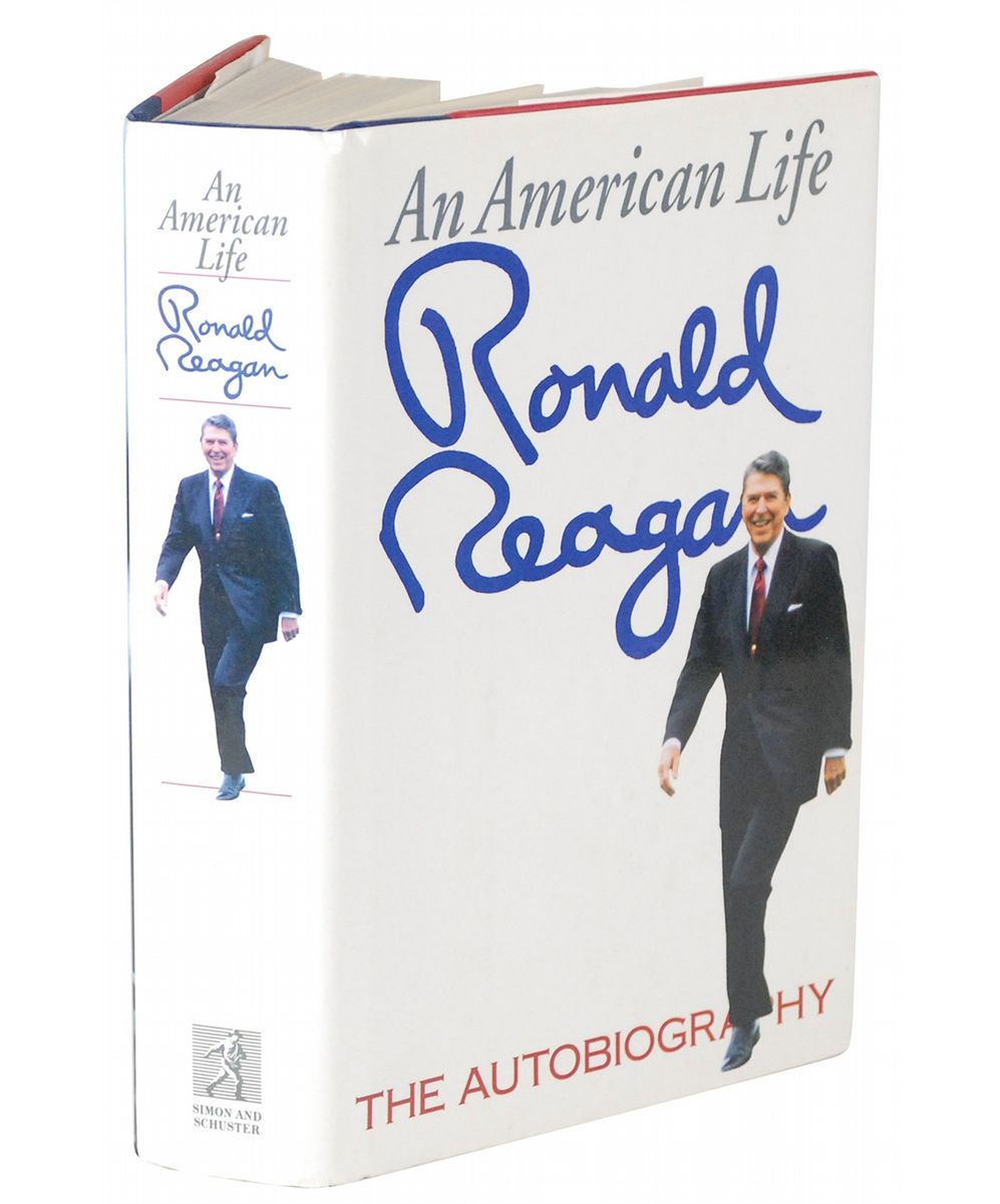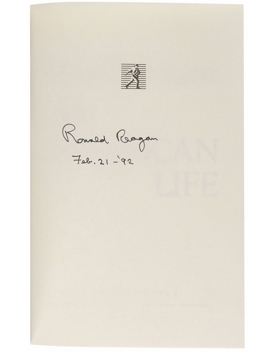 Signed book: An American Life. First edition, first printing. NY: Simon & Schuster, 1990. Hardcover with dust jacket, 6.5 x 9.5, 747 pages. Signed on a free end page in black felt tip, “Ronald Reagan, Feb. 21—’92.” In fine condition.