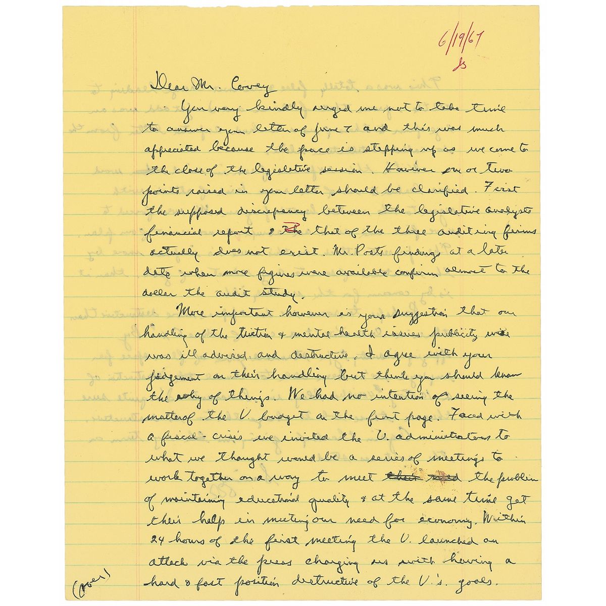Lengthy draft ALS signed “RR,” one page, lightly-lined both sides, 8 x 10, June 19, 1967. Letter to a concerned constituent. In part: "More important however is your suggestion that our handling of the tuition & mental health issues publicity wise was ill advised and destructive.…We had no intention of seeing the matter of the V[eteran’s] budget on the front page. Faced with a fiscal crisis we invited the V Administration to what we thought would be a series of meetings to work together on a way to meet the problem of maintaining educational quality & at the same time get their help in meeting our need for economy…The V launched an attack via the press charging us with having a hard & fast position destructive of the V’s goals. This was a totally false & dishonest charge leading to all the uproar that followed and I might add was an eye opener to those of us who had expected better from the so-called intellectual elite.” In fine condition. Immediately upon taking office in 1967, Reagan worked hard to balance the state budget, making cuts and approving tax hikes.