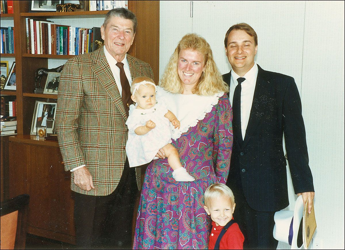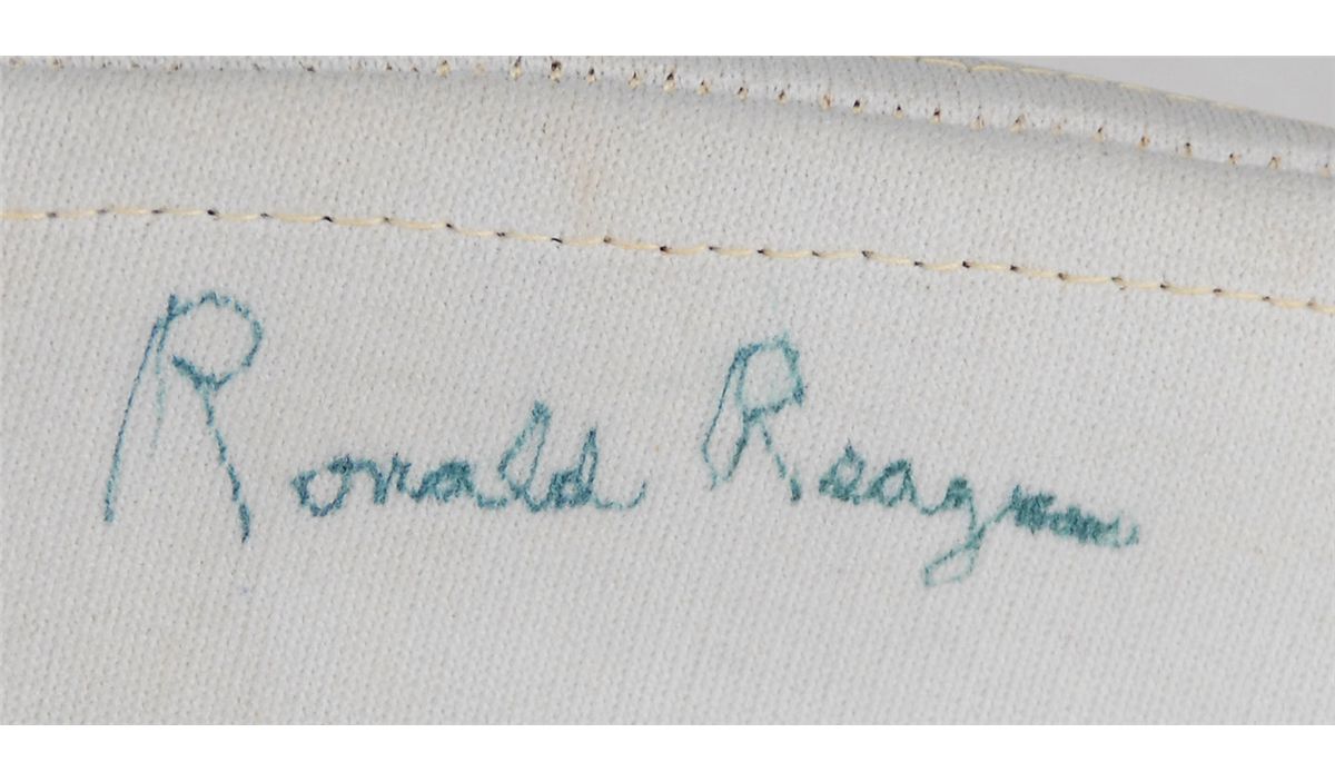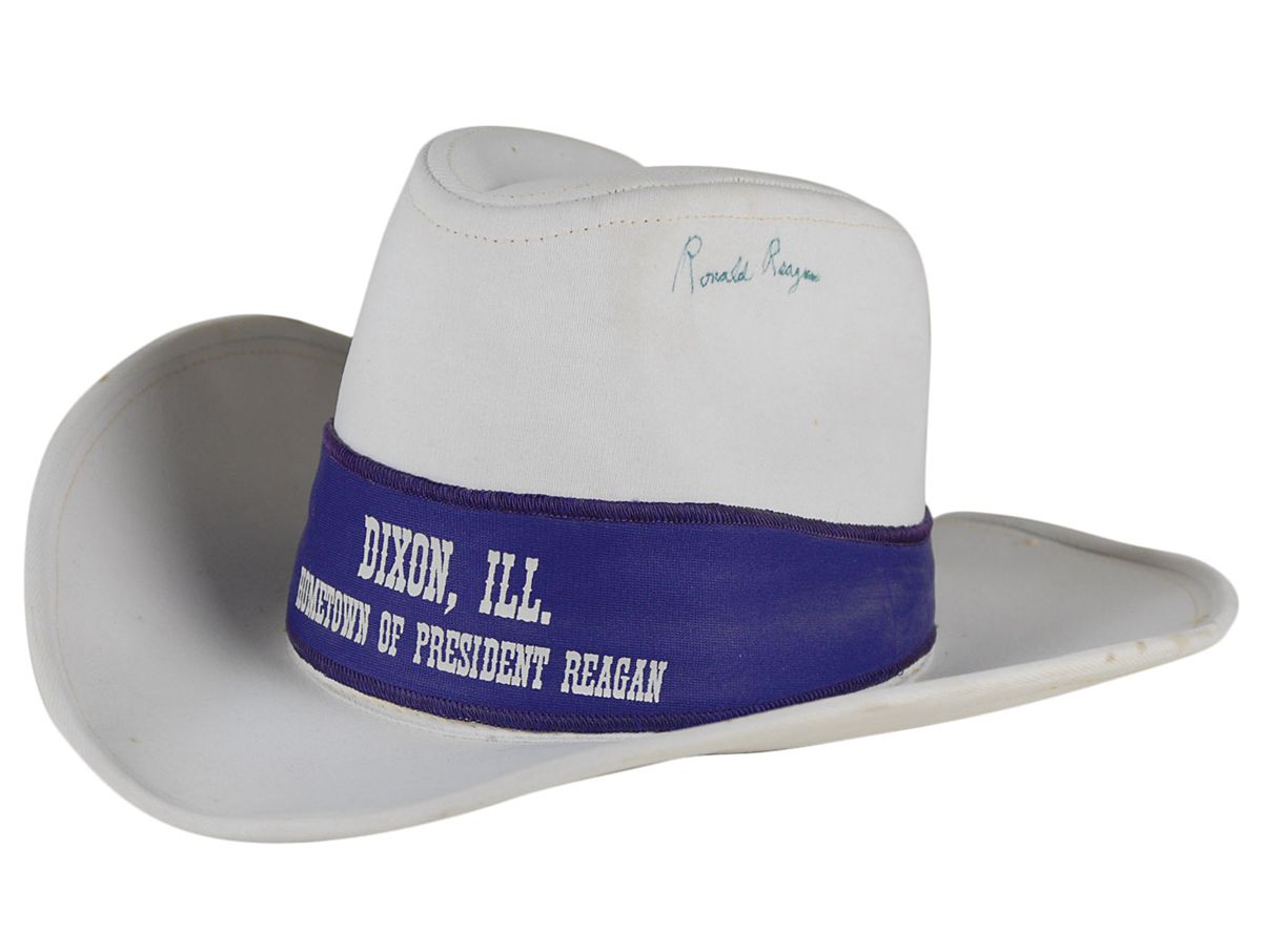 White cowboy hat with a purple band honoring Reagan’s hometown of Dixon, Illinois, clearly signed on the side in felt tip by Reagan. In fine condition, with some expected light spreading of ink due to nature of material, and some light spotting to hat. Accompanied by a letter of provenance from Ken Wendland, who states that the “hat was signed while I…visited President Reagan at his office on October 13, 1989. The autograph is verified by the photo taken in his office on October 13, 1989.” Also accompanied by a color copy of aforementioned photo, showing Reagan with Wendland and his family, with the hat in Wendland’s hand.