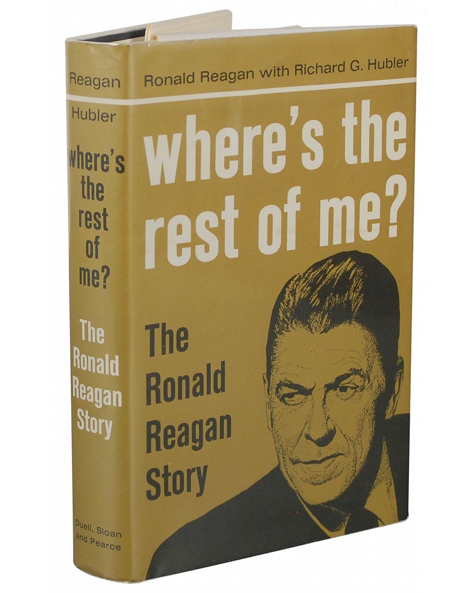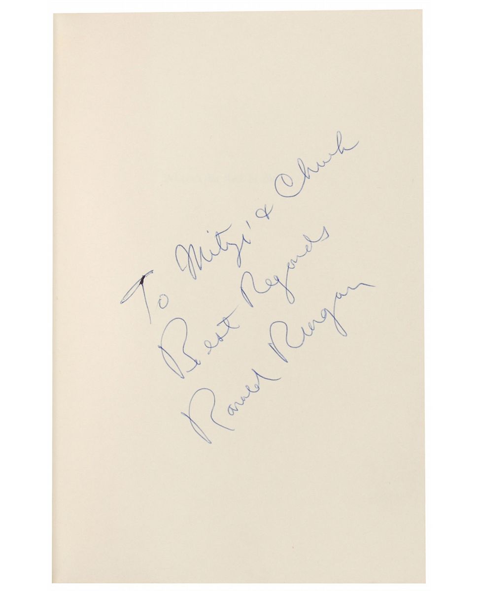 Signed book: Where’s the Rest of Me? Second printing. NY: Duell, Sloan and Pearce, 1965. Hardcover with dust jacket, 5.75 x 8.25, 316 pages. Signed and inscribed on the first free end page in blue ballpoint, “To Mitzi & Chuck, Best regards, Ronald Reagan.” In fine condition.