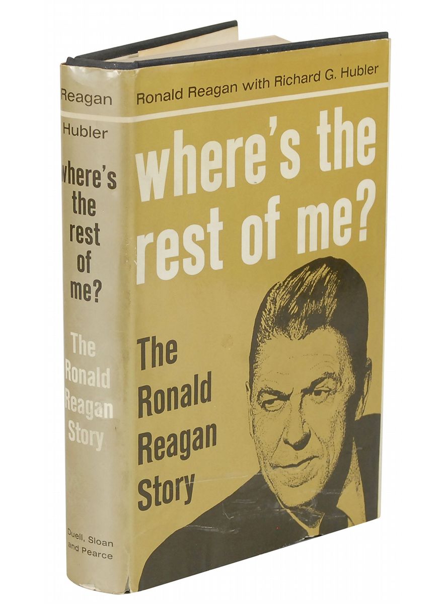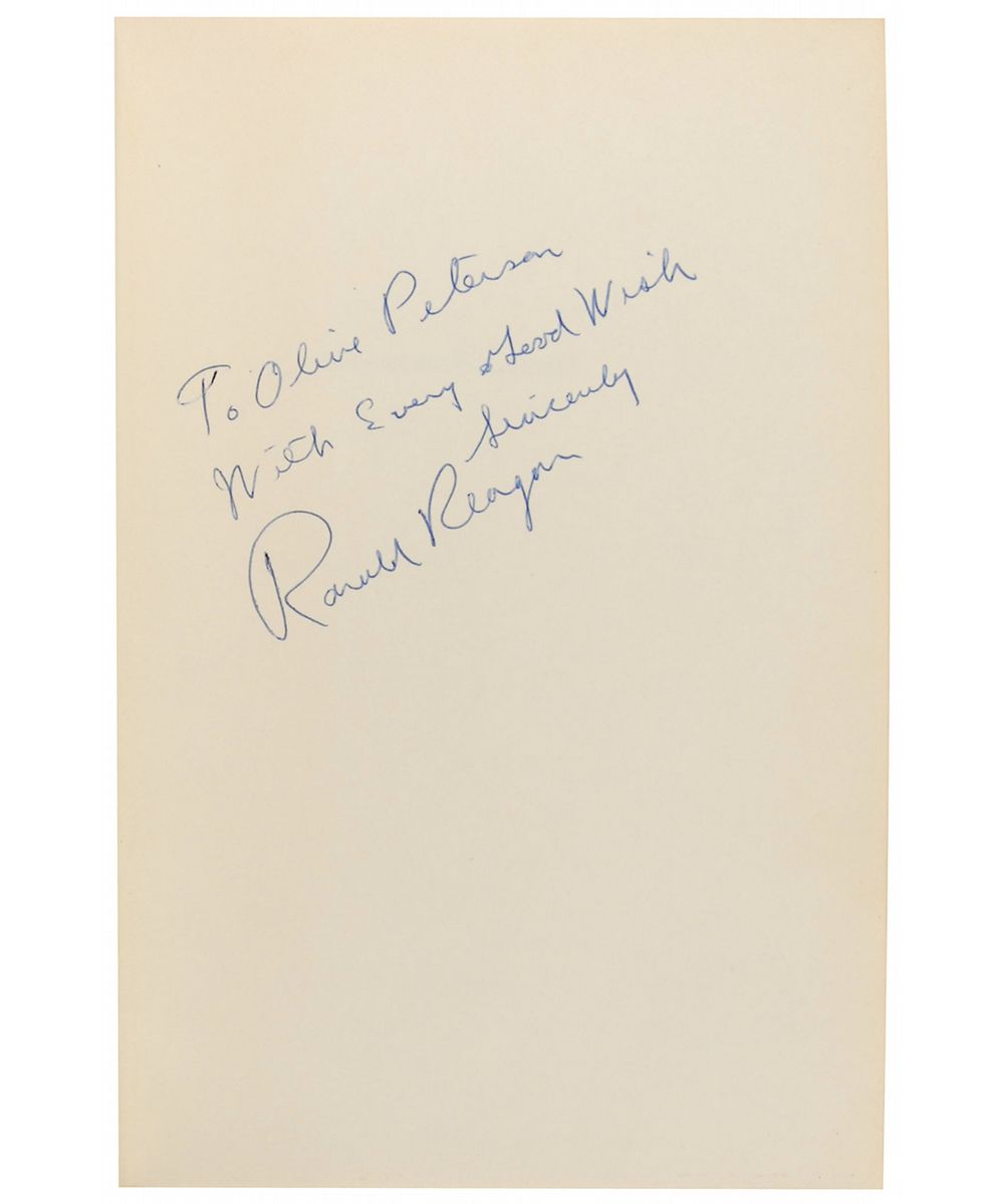 Signed book: Where’s the Rest of Me? First edition. NY: Duell, Sloan and Pearce, 1965. Hardcover with dust jacket, 5.75 x 8.25, 316 pages. Signed and inscribed on the first free end page in blue ballpoint, “To Olive Peterson, With every good wish, Sincerely, Ronald Reagan.” In fine condition, with creases and light edge toning to dust jacket. Published roughly 15 years before his presidency, Where's the Rest of Me? is the witty autobiography of the then-Hollywood actor, commenting on his fellow movie stars and the Screen Actors' Guild; addressing his own union involvement, Reagan outlines his transformation from liberal to conservative.
