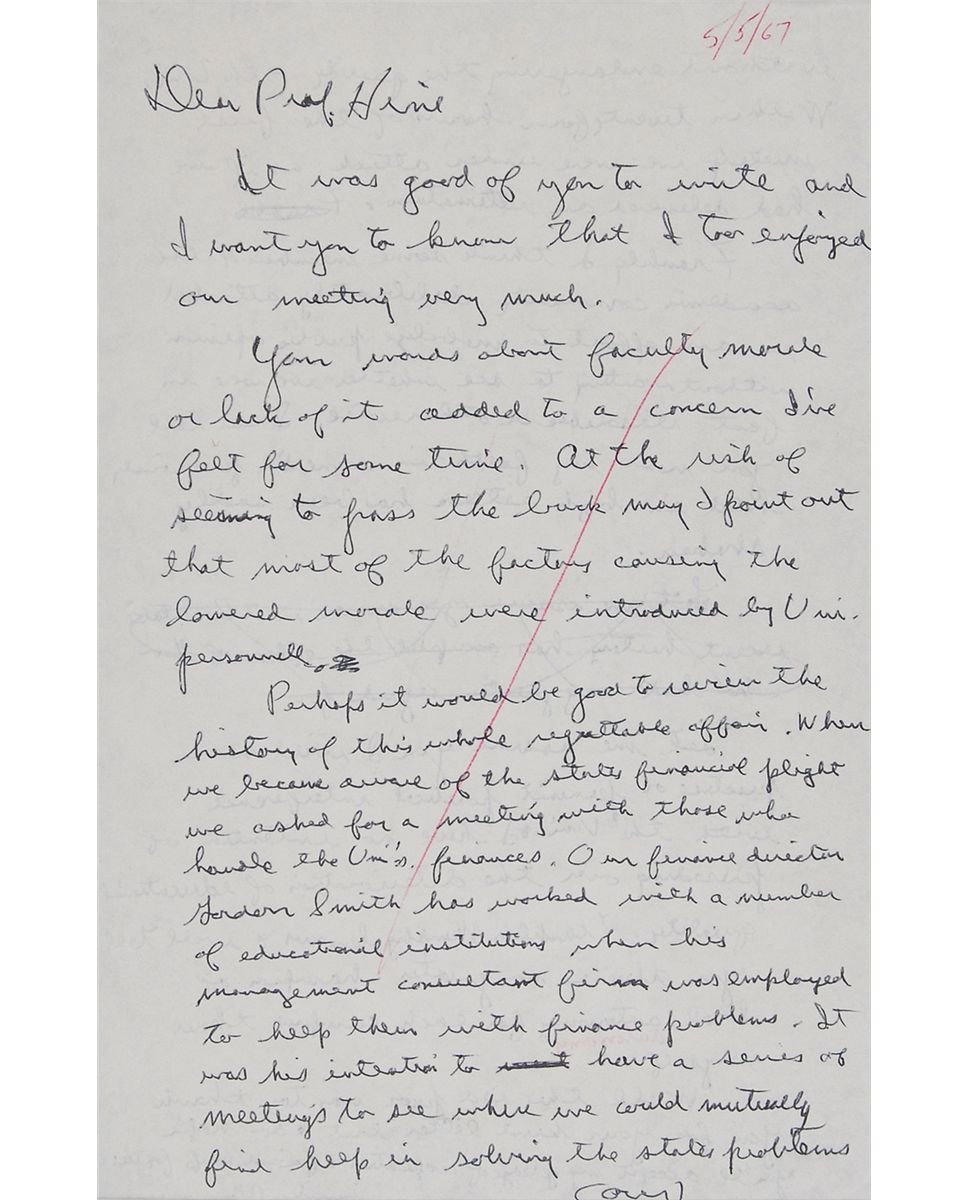 ALS signed “RR,” one page both sides, 5.75 x 8.75, May 5, 1967. Letter to Professor Hine, in part: “Your words about faculty morale or lack of it added to a concern I’ve felt for some time. At the risk of seeming to pass the buck may I point out that most of the factors causing the lowered morale were introduced by Uni. personnell [sic]. Perhaps it would be good to review the history of this whole regrettable affair. When we became aware of the state’s financial plight we asked for a meeting with those who handle the Uni’s finances. Our finance director Gordon Smith has worked with a number of educational institutions when his management consultant firm was employed to help them with finance problems. It was his intention to have a series of meetings to see where we could mutually find help in solving the states problems without endangering the quality of the Uni. Within twenty four hours of the first meeting we were under attack as if we had delivered an ultimatum. Frankly I think some members of the academic community deliberately attacked in an effort to mobilize public opinion without waiting to see whether we were in fact reasonable or otherwise. I can tell you now my faith in some I’d previously held in high esteem has been sadly shaken. Let me assure I will never practice or permit political interference with the Uni & I have no intention of presiding over the deterioration of educational quality.” Handsomely double-matted and framed with an engraved portrait of Reagan to an overall size of 18.75 x 15.5, with a window on the reverse for viewing the complete letter. In fine condition, with secretarial notations and red ballpoint struck through the text, not affecting readability.