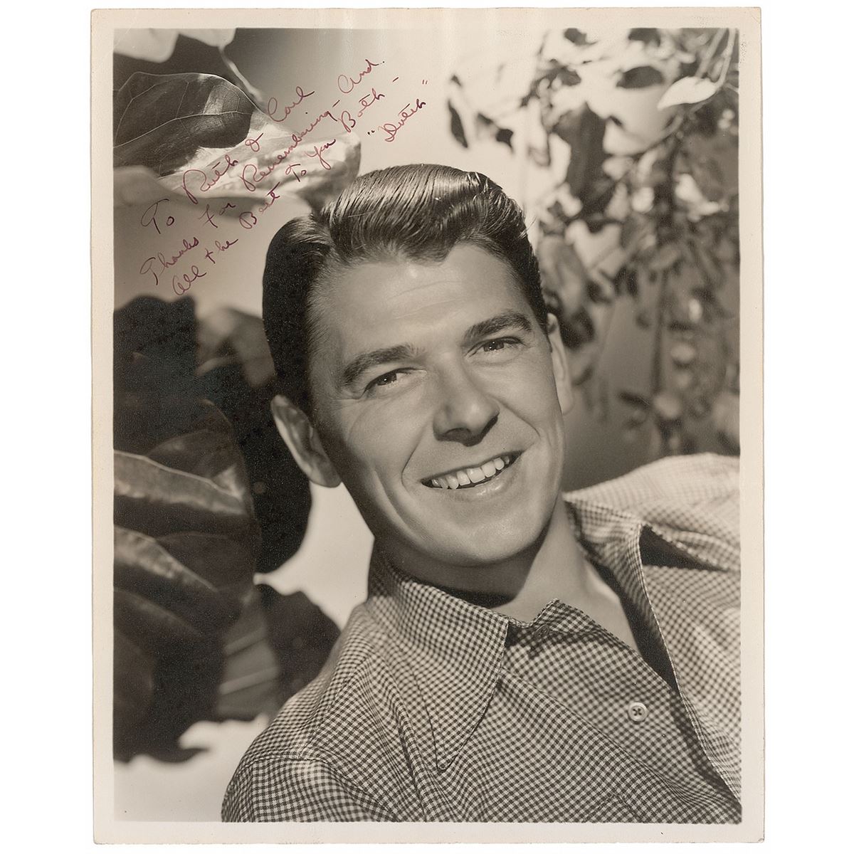 Handsome vintage matte-finish 8 x 10 photo of Reagan during his time as a screen actor, signed and inscribed in fountain pen, “To Ruth & Carl, Thanks For Remembering—And All the Best To You Both—‘Dutch.’” In fine condition, with rippling to top edge and a few creases to edges.