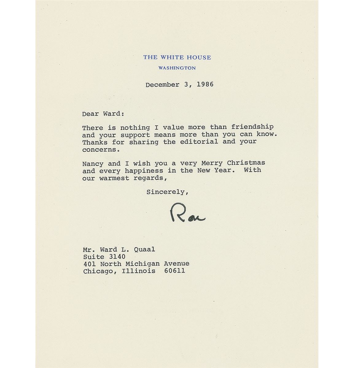 TLS as president signed “Ron,” one page, 6.75 x 8.75, White House letterhead, December 3, 1986. Letter to Ward Quaal, in part: “There is nothing I value more than friendship and your support means more than you can know. Thanks for sharing the editorial and your concerns.” In fine condition. A pioneer of broadcasting, Quaal became friends with Reagan when the unknown actor was doing radio commercials for the popular Chicago station WGN.