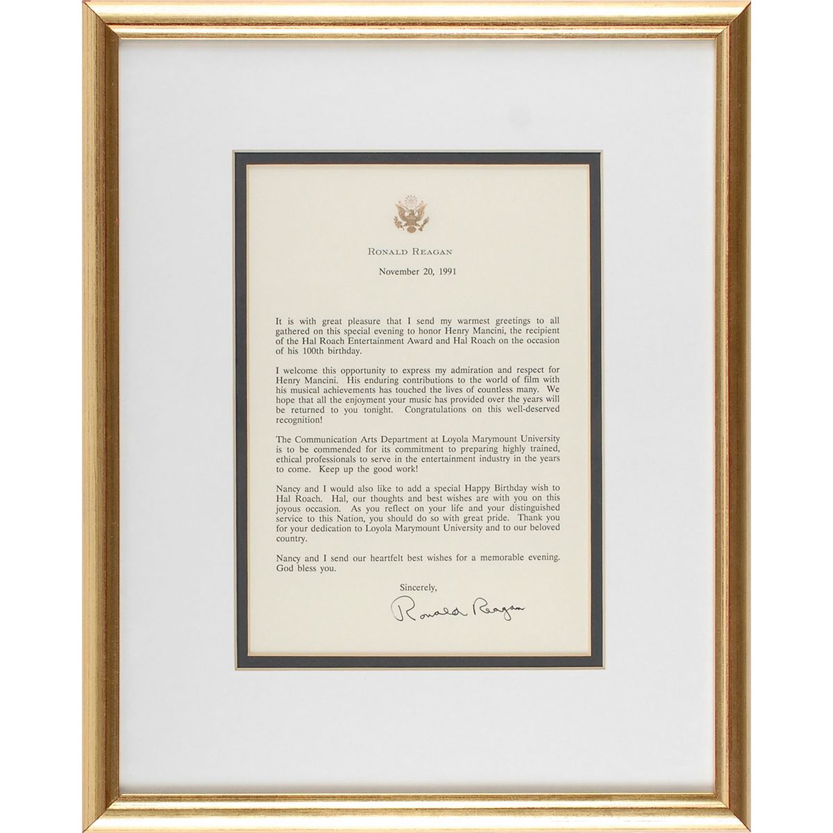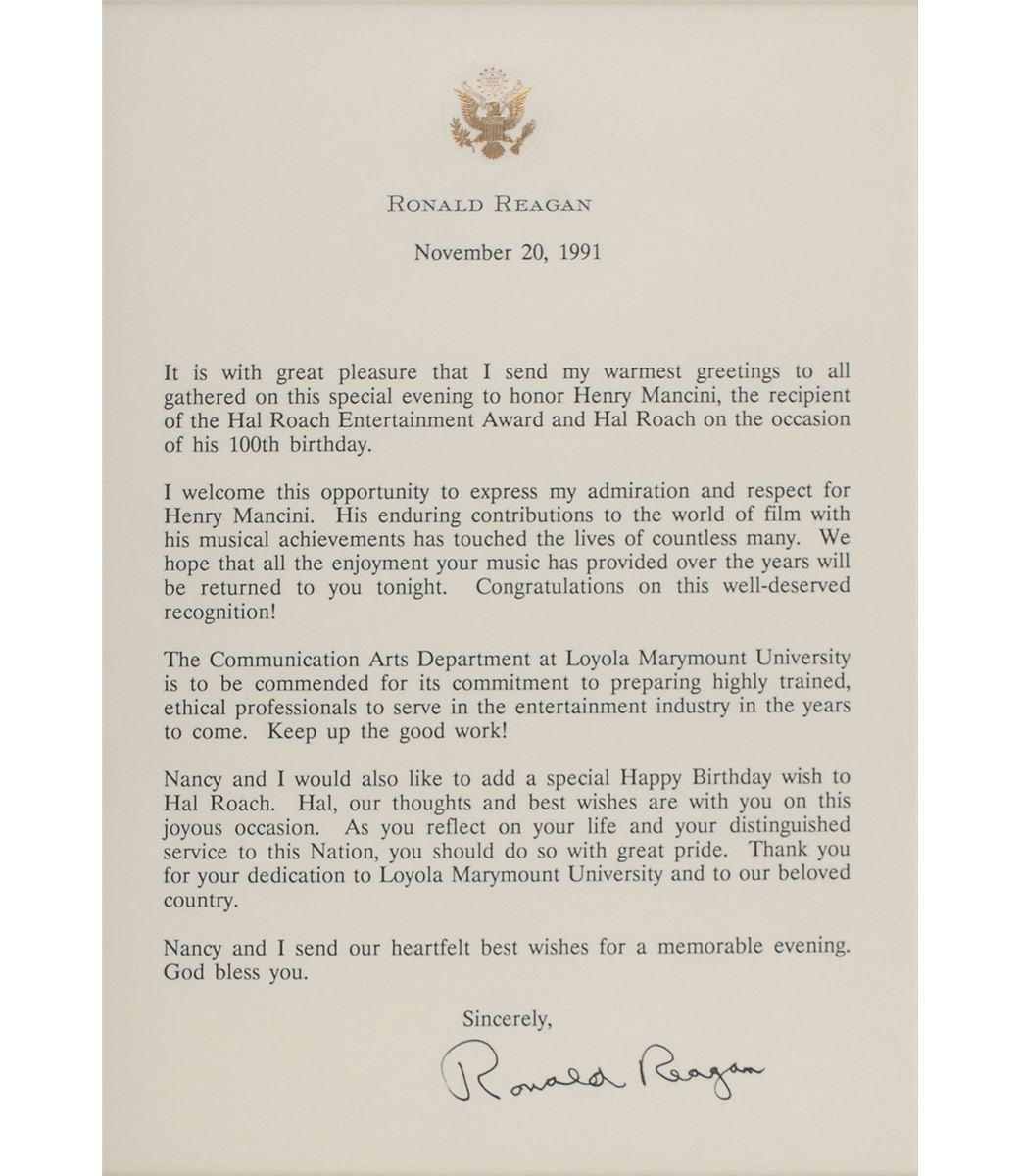 Typescript, one page, 6.25 x 9, embossed presidential letterhead, November 20, 1991. A statement concerning an award given to popular composer Henry Mancini. In part: “It is with great pleasure that I send my warmest greetings to all gathered on this special evening to honor Henry Mancini, the recipient of the Hal Roach Entertainment Award and Hal Roach on the occasion of his 100th birthday. I welcome this opportunity to express my admiration and respect for Henry Mancini. His enduring contributions to the world of film with his musical achievements has touched the lives of countless many. We hope that all the enjoyment your music has provided over the years will be returned to you tonight.” Handsomely matted and framed to an overall size of 12.5 x 15.5. In fine condition. A nice connection between Reagan’s early career in the entertainment industry and his later role as a respected American leader.