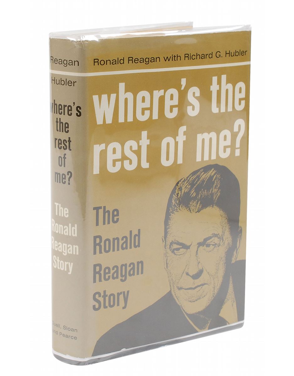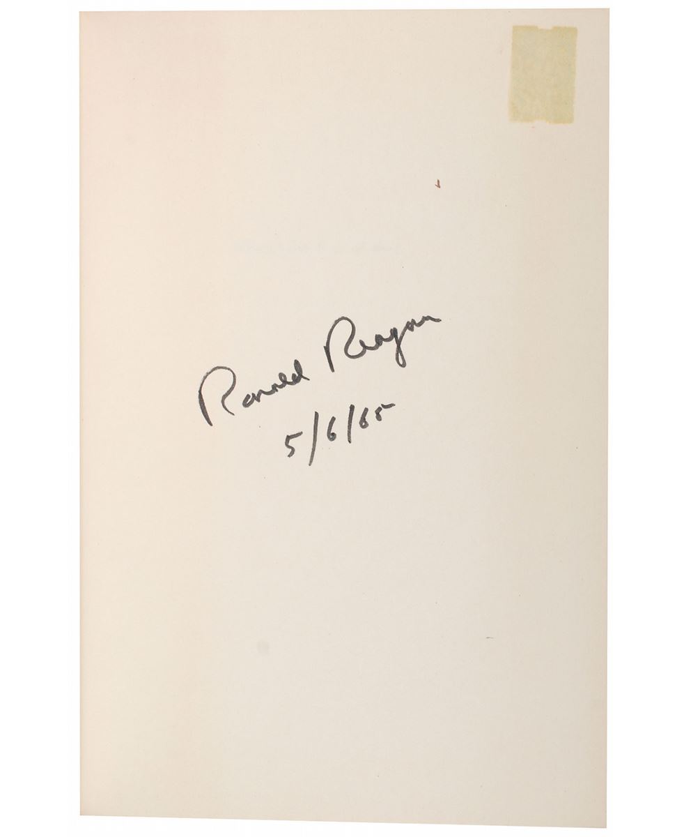 Signed book: Where’s the Rest of Me? First edition. NY: Duell, Sloan and Pearce, 1965. Hardcover with dust jacket, 5.75 x 8.5, 316 pages. Signed on the first free end page in black felt tip, “Ronald Reagan, 5/6/65.” Light overall toning and a block of toning to one corner of the first free end page, and a few trivial dings to the dust jacket, otherwise fine condition.
