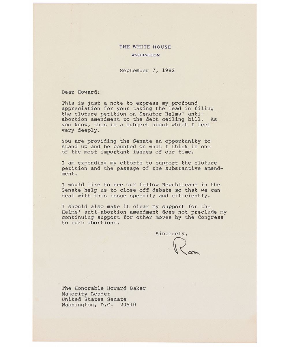 TLS as president signed “Ron,” one page, 7 x 10.5, White House letterhead, September 7, 1982. Letter to Senate Majority Leader Howard Baker. In full: “This is just a note to express my profound appreciation for your taking the lead in filing the cloture petition on Senator Helms' anti-abortion amendment to the debt ceiling bill. As you know, this is a subject about which I feel very deeply. You are providing the Senate an opportunity to stand up and be counted on what I think is one of the most important issues of our time. I am expending my efforts to support the cloture petition and the passage of the substantive amendment. I would like to see our fellow Republicans in the Senate help us to close off debate so that we can deal with this issue speedily and efficiently. I should also make it clear my support for the Helms anti-abortion amendment does not preclude my continuing support for other moves by the Congress to curb abortions.” In fine condition. Reagan’s administration was silent on the issue of abortion until 1982, when Jesse Helms introduced an amendment to a debt ceiling bill that would ban federal funding and encourage challenges against Roe v. Wade. The bill was filibustered and the result of the vote for cloture was unsuccessful, and the measure was not passed once it did come to a vote.