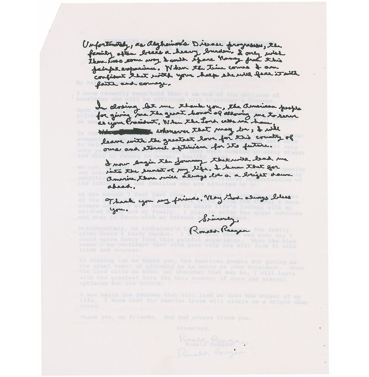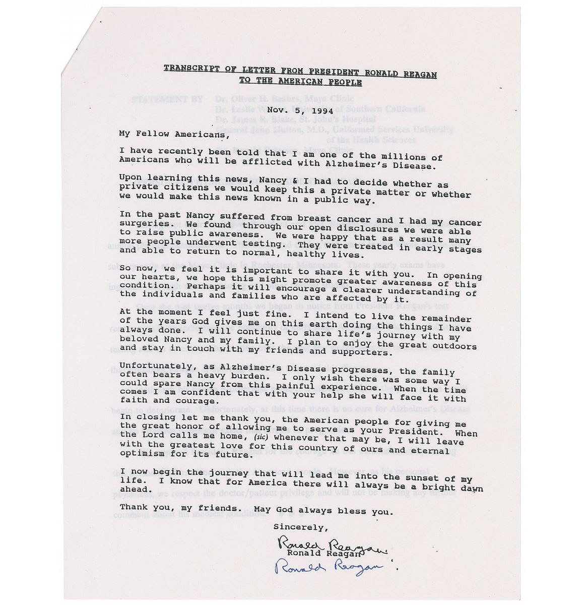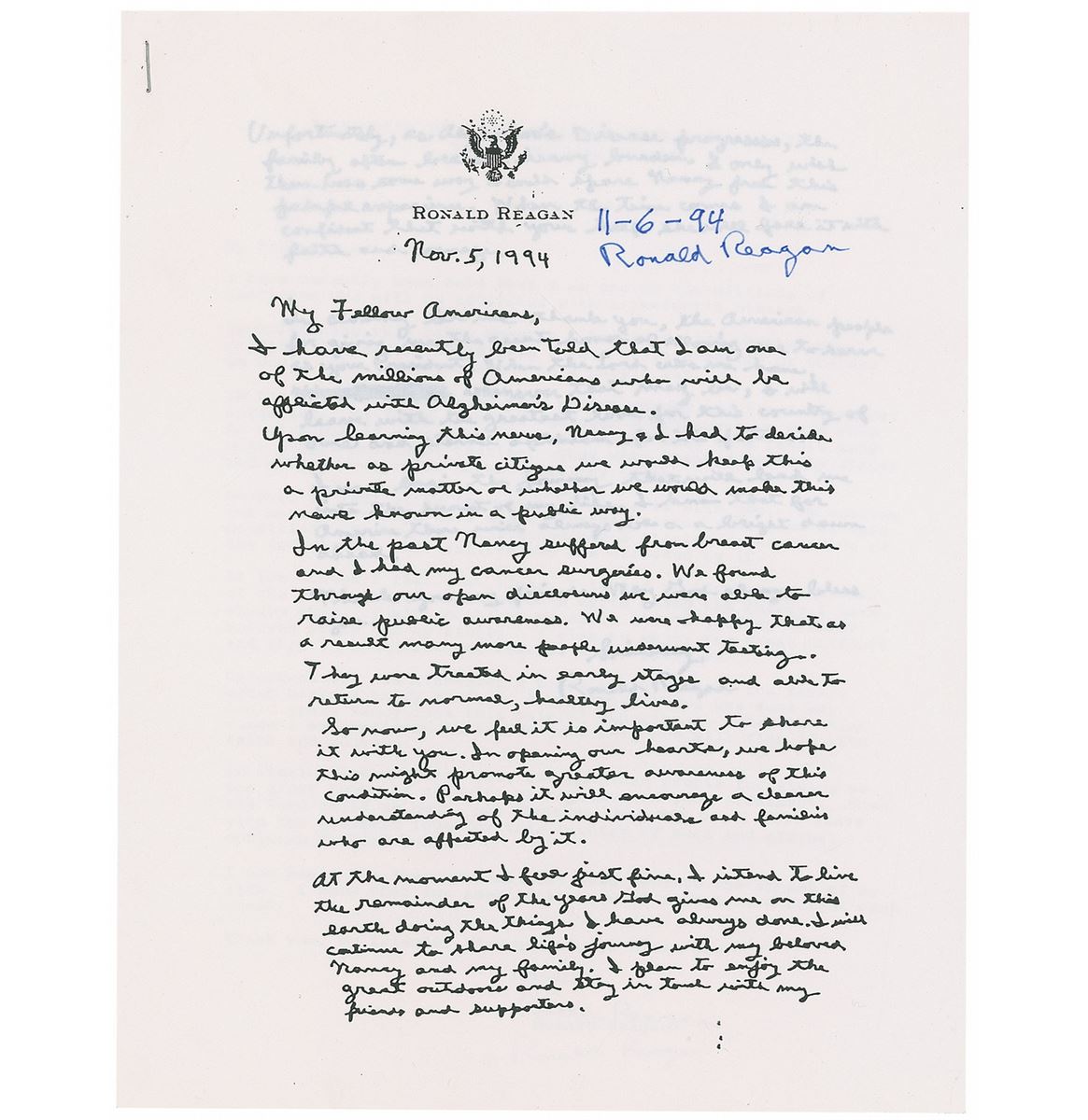 Souvenir photocopy of Reagan’s letter disclosing his diagnosis of Alzheimer’s Disease to the American people, two pages, 8.5 x 11, November 5, 1994, signed at the top in blue felt tip on the day after issuing the statement, “11-6-94, Ronald Reagan.” A typed transcript is stapled to the letter, also signed in blue felt tip by Reagan. In fine condition. Reagan’s disclosure of his condition raised a great amount of public awareness about the devastating affliction. An unusual twice-signed format.