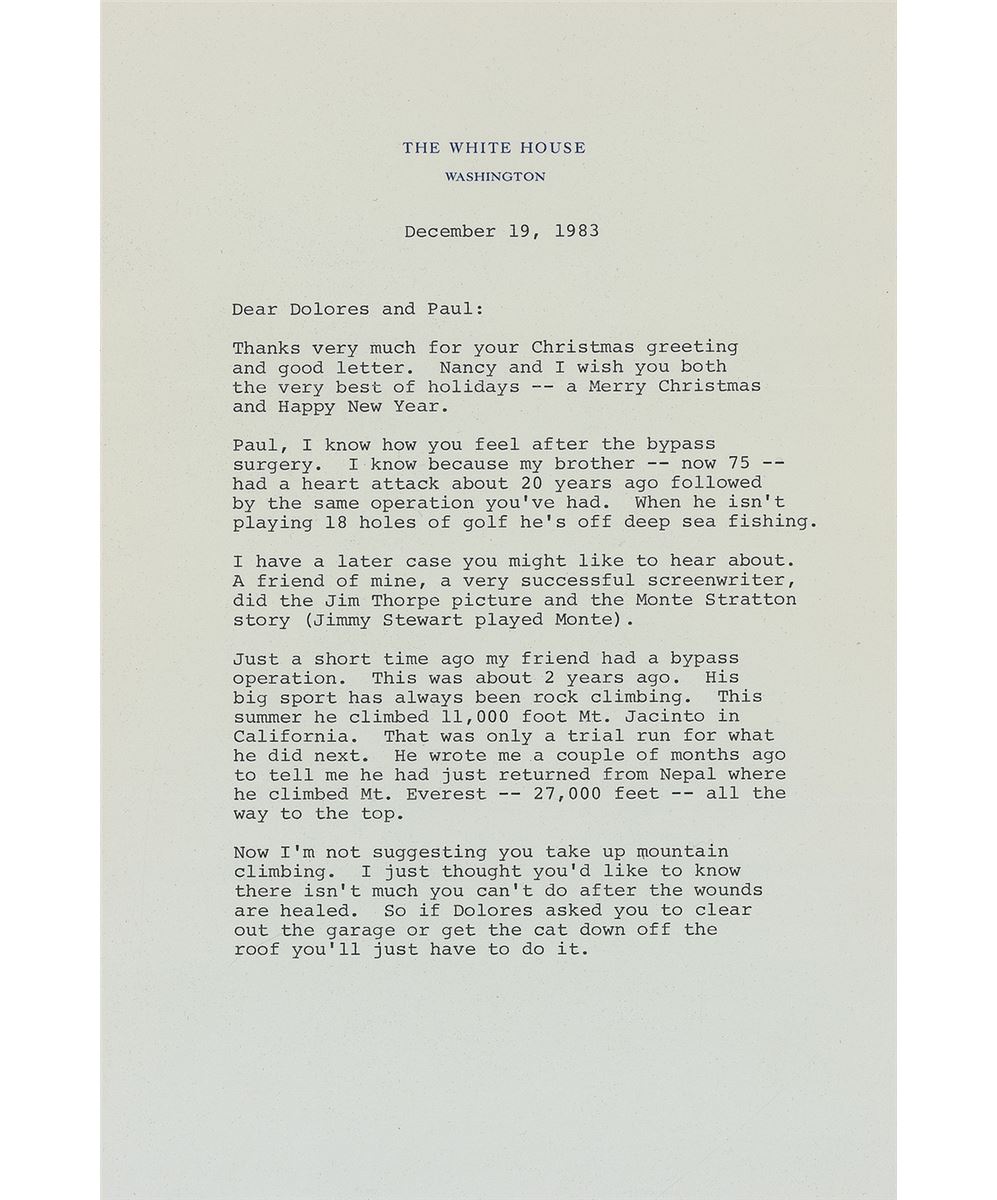 TLS as president signed “Ron,” two pages, 7 x 10.5, White House letterhead, December 19, 1983. Letter to Dolores and Paul Ballachino, in part: “I know how you feel after the bypass surgery…A friend of mine, a very successful screenwriter, did the Jim Thorpe picture and the Monte Stratton story (Jimmy Stewart played Monte). Just a short time ago my friend had a bypass operation…This summer he climbed 11,000 foot Mt. Jacinto in California. That was only a trial run for what he did next. He wrote me a couple months ago to tell me he had just returned from Nepal where he climbed Mt. Everest—27,000 feet—all the way to the top. Now I’m not suggesting you take up mountain climbing. I just thought you’d like to know there isn’t much you can’t do after the wounds are healed. So if Dolores asked you to clear out the garage or get the cat down off the roof you’ll just have to do it.” In fine condition, with slight soiling to the signed page.
