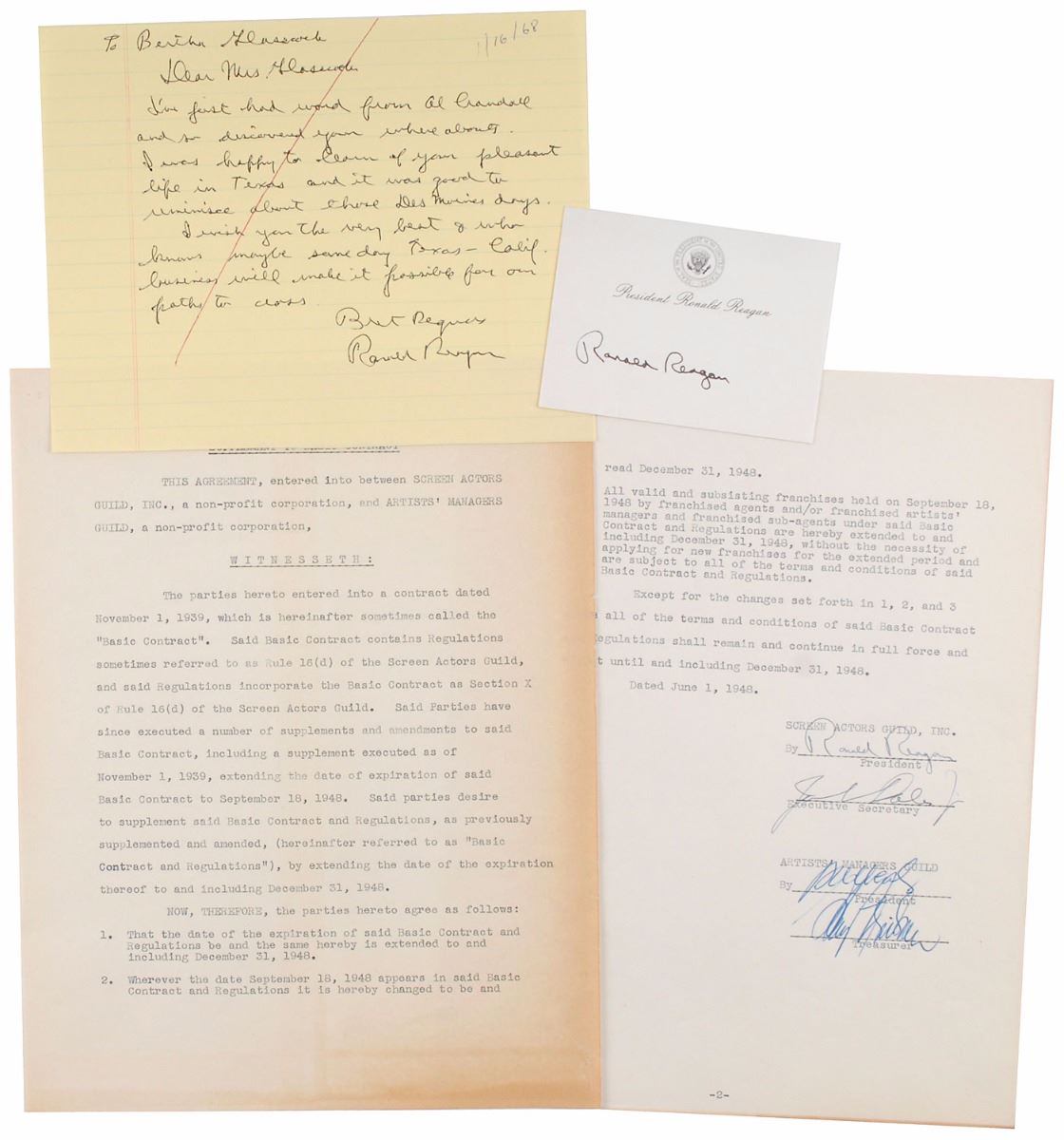 Three items representing several different eras of his life: a DS, two pages, 8.5 x 11, June 1, 1948, regarding an agreement between the Screen Actors Guild and Artists’ Managers Guild, signed at the conclusion by Reagan as president of SAG; a draft ALS as governor of California, one page, 8 x 6.25, notated January 16, 1968, in part, “I was happy to learn of your pleasant life in Texas and it was good to reminisce about those Des Moines days”; and a post-presidential felt tip signature, “Ronald Reagan,” on a white 4 x 3 souvenir ‘post-it’ imprinted with his name and the presidential seal. Toning to the first page of the document and a ballpoint office notation through the text of the draft, otherwise overall fine condition.